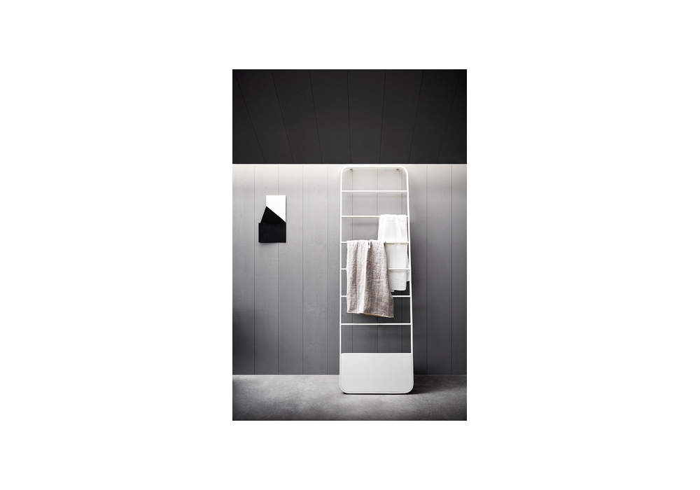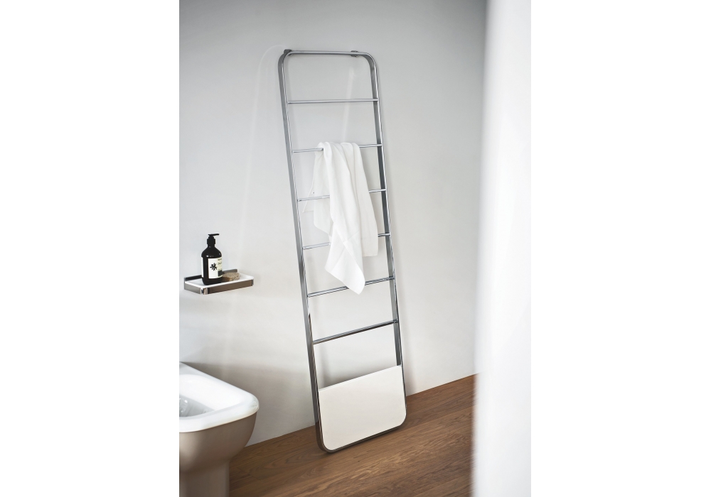 Memory von Benedini Associati für Agape entworfen, ist ein selbstregulierender Handtuchwärmer aus glänzend verchromtem Stahl (mit weißer Frontplatte) oder in Weiß oder Schwarz lackiert. Wandbefestigungsset enthalten.