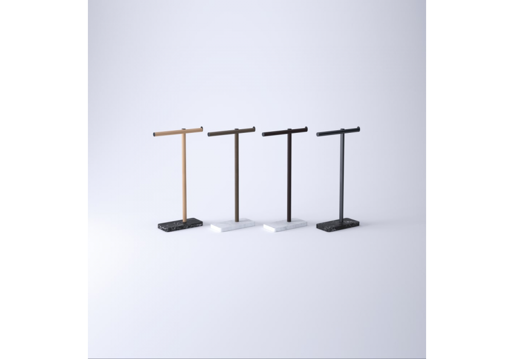 Dot Line designed by Garcia Cumini for Agape is a floor-standing towel holder made with a marble base and a tubular aluminum structure with a brushed black anodized finish or with oak cladding in different finishes.