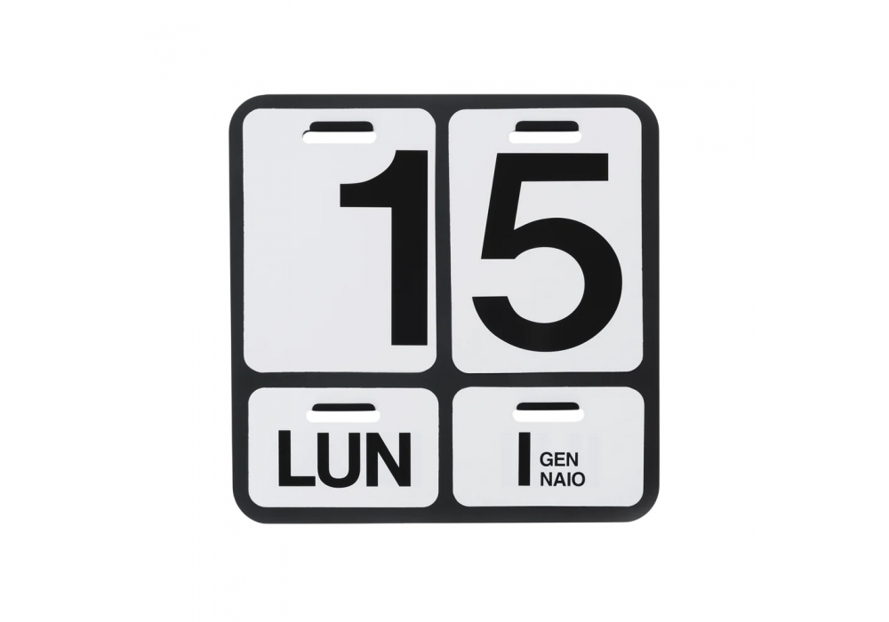 Formosa designed by Enzo Mari for Danese Milano is a perpetual wall calendar featuring an anodized aluminum base that supports the removable PVC sheets that mark the date. The typeface used, in the black and red versions, is Helvetica, a classic Mari and Danese Milano design.