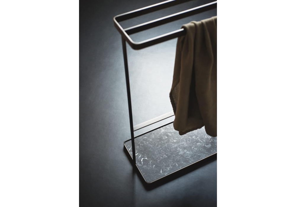 Memory designed by Benedini Associati for Agape is a floor-standing towel holder with a stainless steel structure in various finishes and a base in marble or white Cristalplant®.