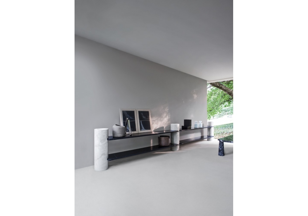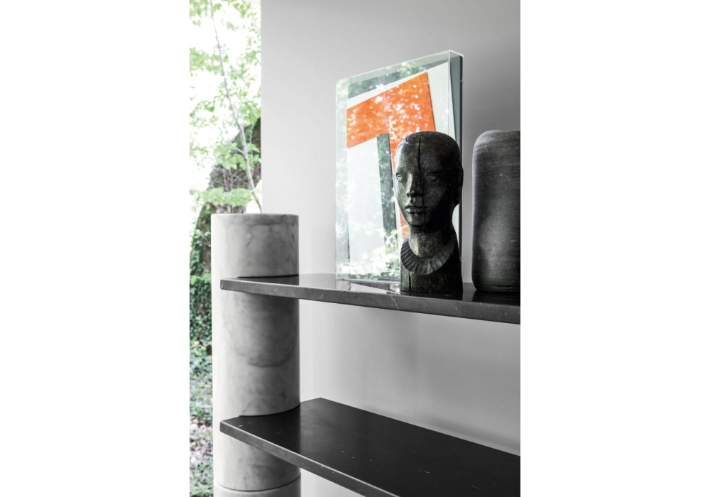 Loico designed by Angelo Mangiarotti for Agapecasa is a modular bookcase made of marble in different finishes. It is characterized by cylindrical and stackable load-bearing elements and shelves that are fixed in the appropriate joints. The shelves are equipped, on the lower side, with carbon fiber fabric that has a structural and safety function.