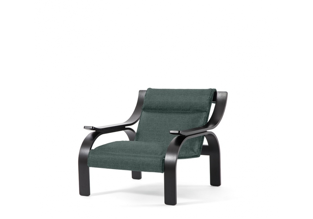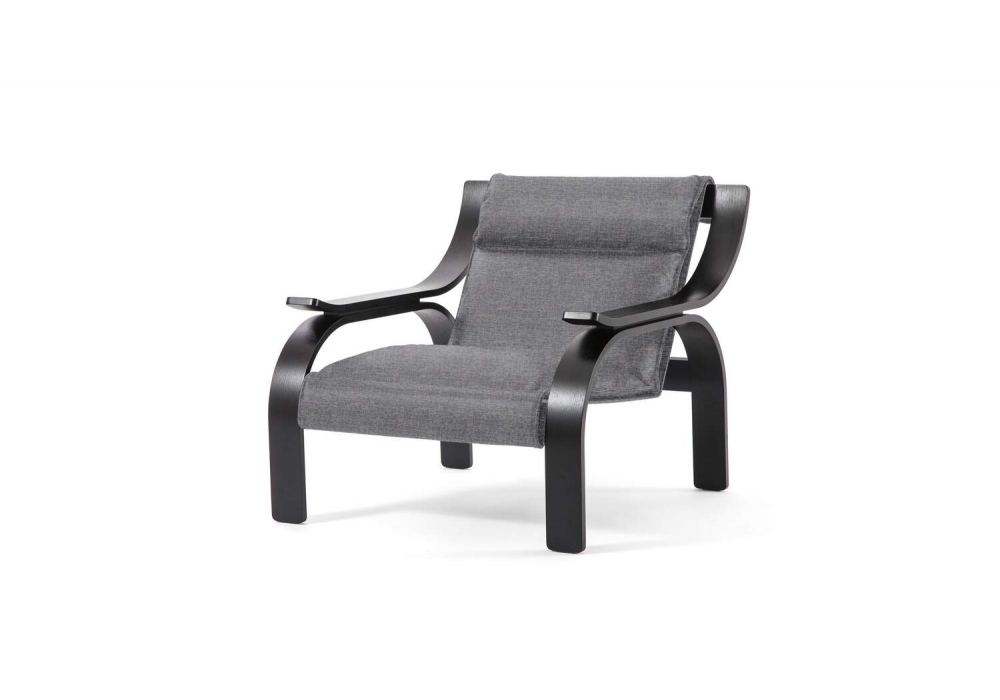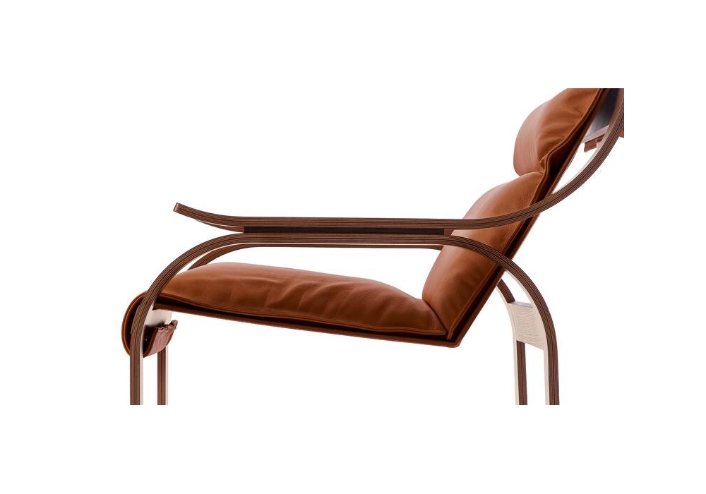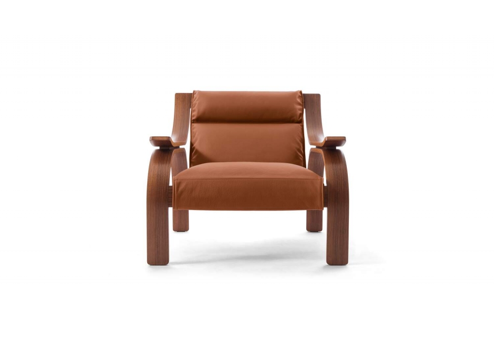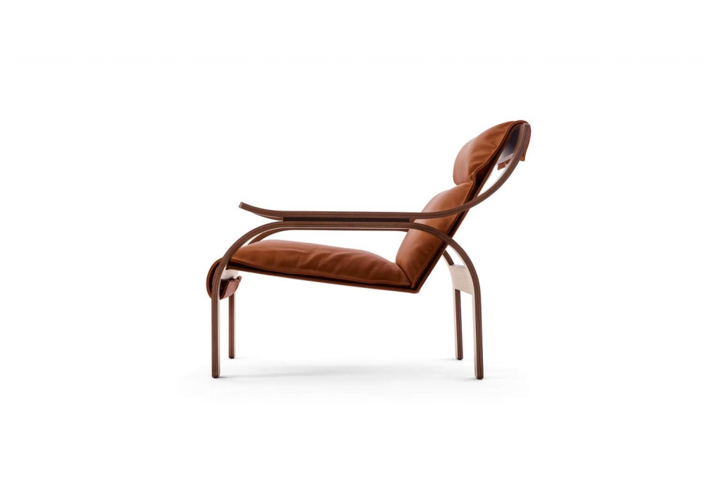 722 Woodline designed by Marco Zanuso for Cassina is an armchair made with a curved beech plywood structure, veneered in ash or walnut. The cushion cover is removable and fastened with leather or fabric snaps.
