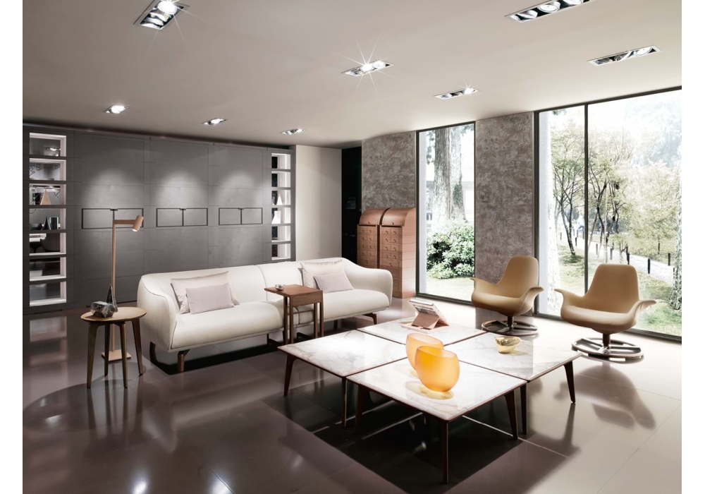 Tilt designed by M2Atelier for Giorgetti is a swivel armchair with backrest structure in steel section and padding in flexible polyurethane. The column and base are in bronzed metal with inserts in canaletto walnut for the column and curved solid wood for the base. The non-removable cover can be in fabric or leather. On request, it is possible to create a two-tone upholstery, with the external part in leather and the internal part in fabric or leather.