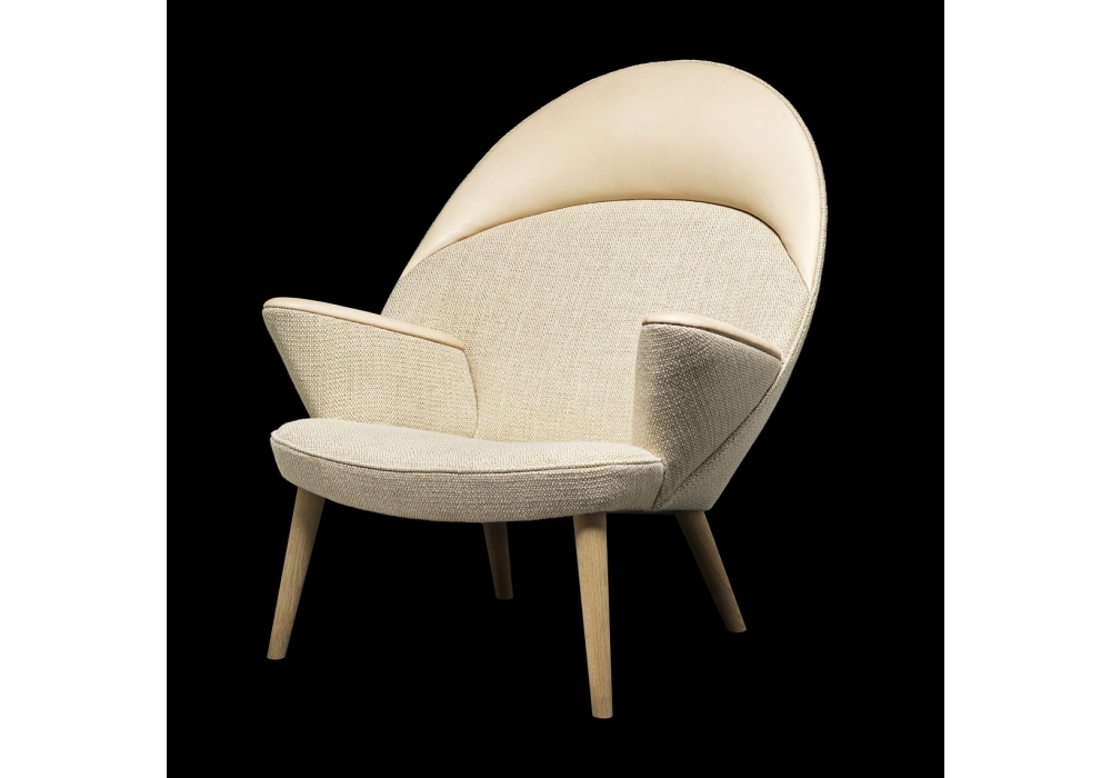 PP521 Upholstered Peacock designed by Hans J. Wegner for PP Møbler is upholstered using only natural materials like flax fibers, cotton, jute straps, palm leaves and horsehair. This is the only way to ensure that this kind of easy chair will be worn in rather than worn out with time. The Upholstered Peacock is, as the name implies, an upholstered interpretation of the pp550 Peacock Chair from 1947, one of Wegner's all time classics and one of his personally most beloved designs. In the Upholstered Peacock Wegner has repeated the arch from the original version and then covered the construction with fabric making a softer chair. The neck and the armrests allow the seated to indulge in the sensible touch of leather, right where it matters the most.