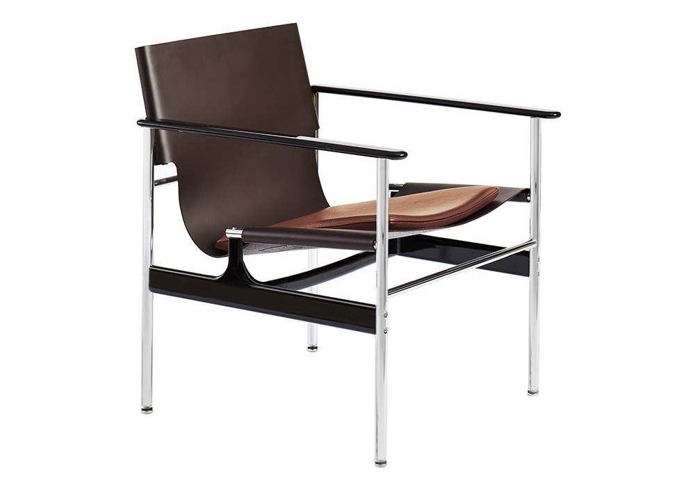 Pollock designed by Charles Pollock for Knoll is an armchair with a chromed tubular steel structure, with armrests and a black painted aluminum frame. Steel feet. Straps covered in leather in three different colors. Cushion in polyurethane rubber covered in leather.
