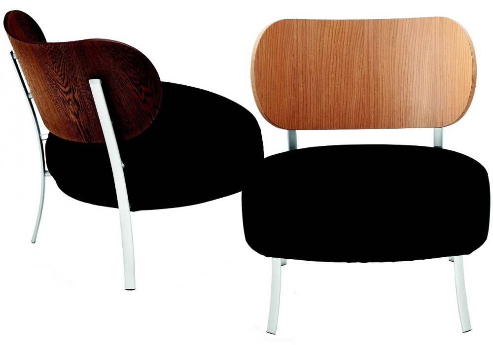 Bistrò designed by Vico Magistretti for Depadova is a low armchair with padded seat and wooden back. Steel frame with seat in elastic straps covered with polyurethane foam. Back in veneered birch plywood. Legs in extruded aluminum profile with oval section, matt anodised. Back veneered in wengé or natural oak. Upholstery in removable fabric or fixed in leather in different finishes.