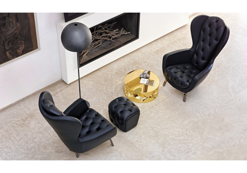 Guelfo designed by Lapo Ciatti for Opinion Ciatti is a padded bergère made with capitonné work. Structure in black nickel and upholstery in various types of fabric and leather. Available in different finishes.