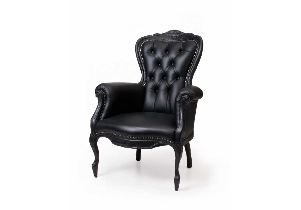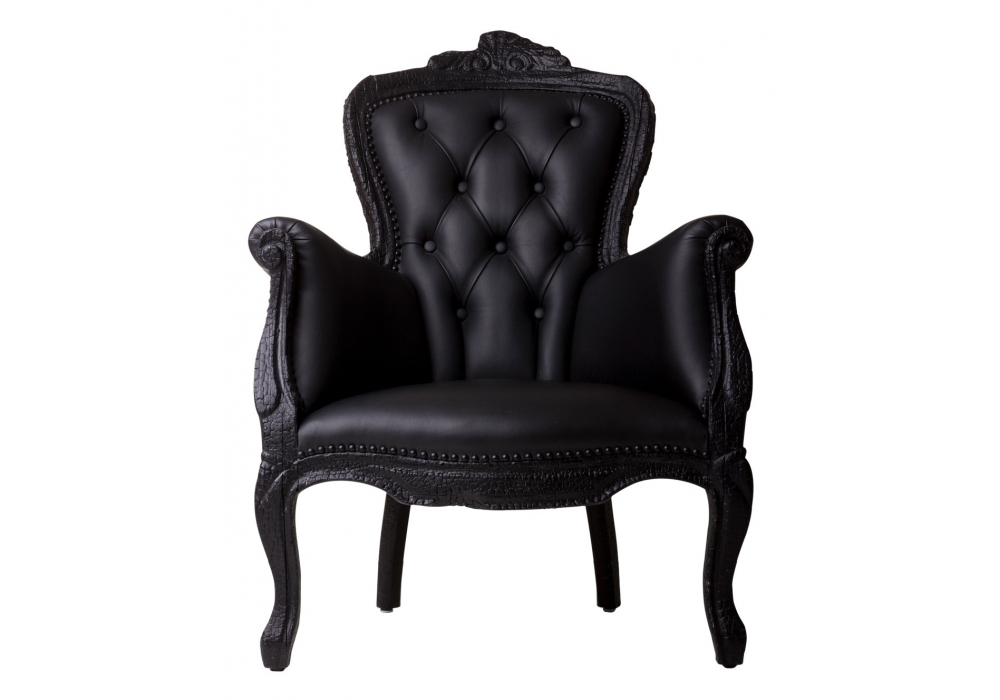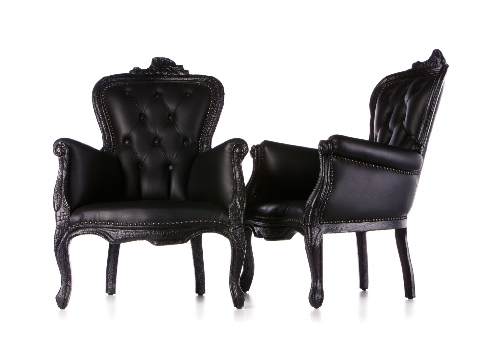 The Smoke Armchair designed by Maarten Baas for Moooi is made of leather upholstery and structure in burnt wood finished with epoxy resin.