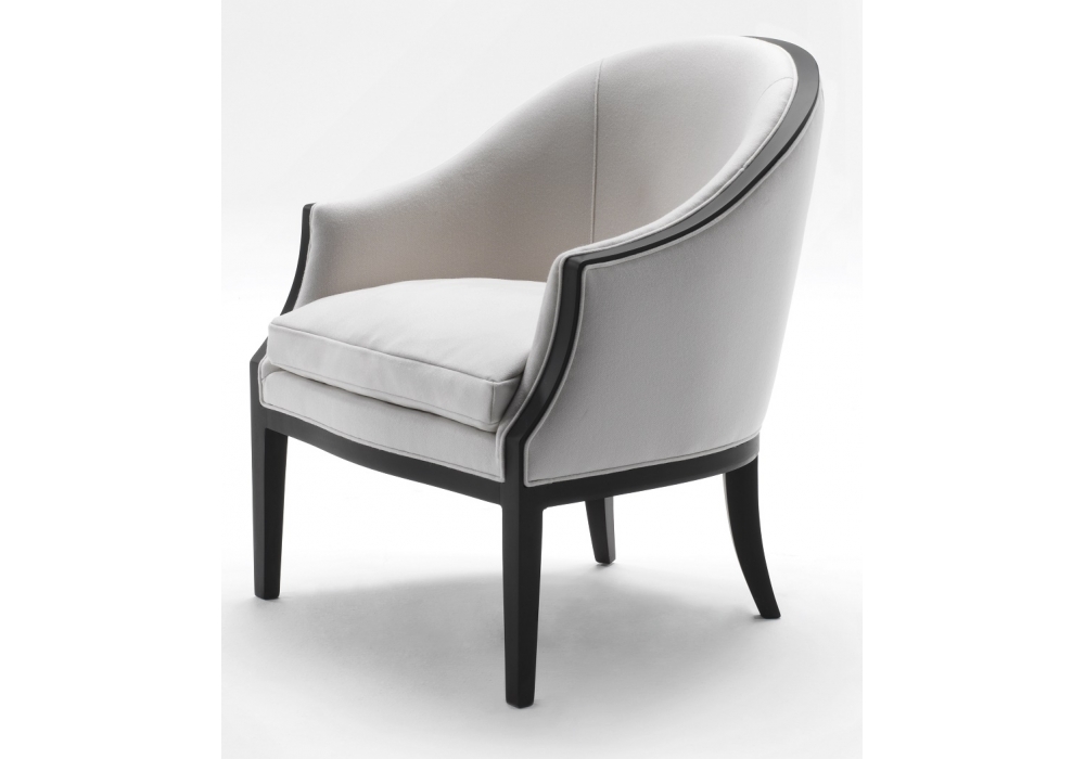 ABC designed by Piero Lissoni for Living Divani is an armchair with simple design and soft lines. Armchair with frame in beech, with acrylic paint natural polished, charcoal dyed or manual finishing with white idropainting, low environmental impact. Support in cross-woven, coated rubber elastic straps. Frame padding in differentiated density polyurethane foam. Covering in needle punched, resinated, non-woven polyester fibre, bonded onto a polyamide velveteen backing. Seat cushion in prewashed and sterilized goose down, on request available also in differentiated density polyurethane foam, coated with acrylic fibre layers. Non-removable fabric or leather upholstery. Seat depth 54cm.