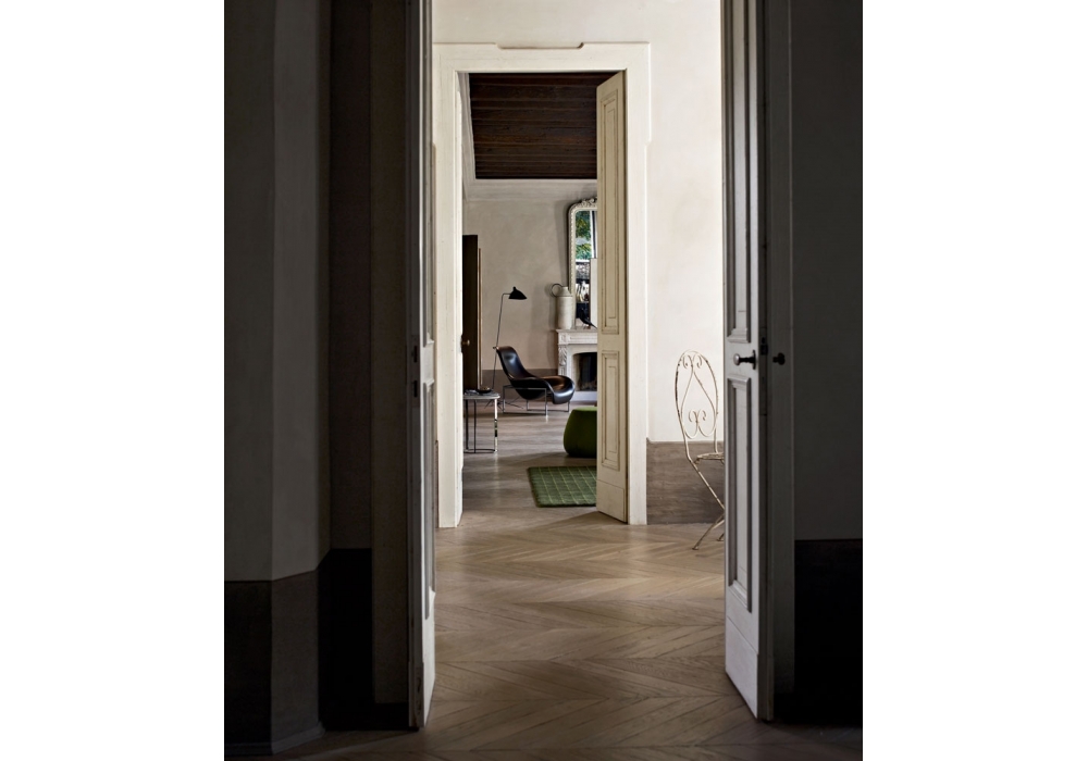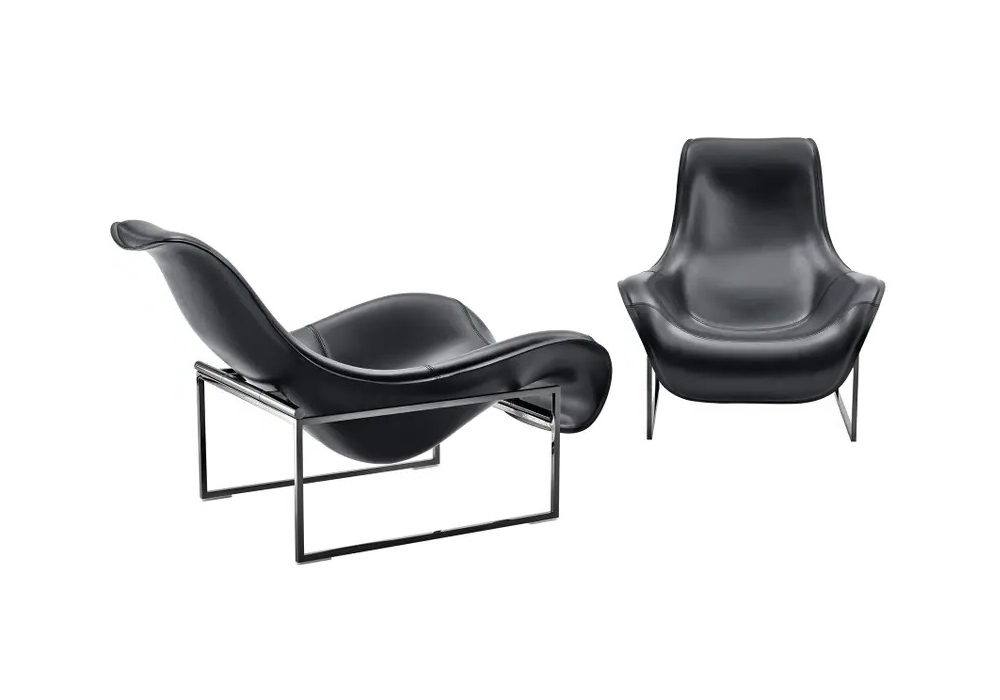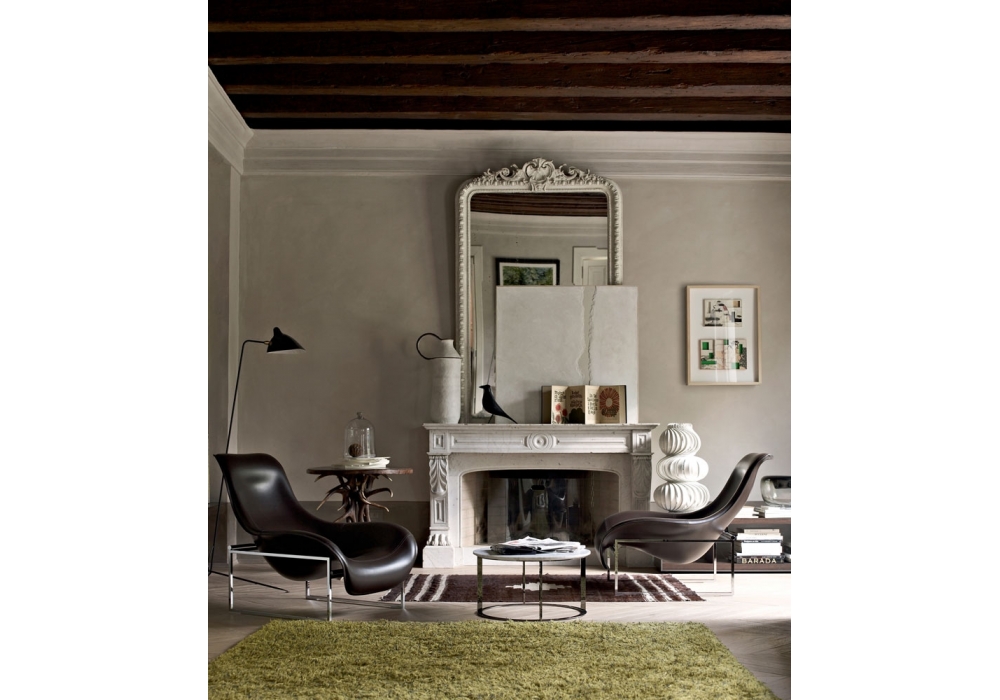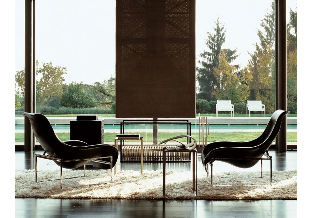 Mart designed by Antonio Citterio for B&B Italia is a relax armchair with balancing movement with a chromed or painted steel structure. Upholstery in leather or hide. Available with or without headrest cushion, including a headrest counterweight in the same finishes as the structure.