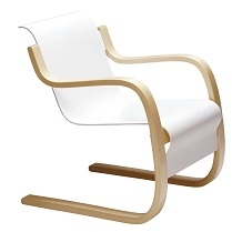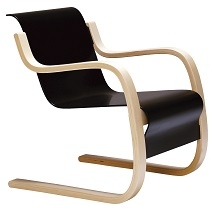 42 Armchair designed by Alvar Aalto for Artek is armchair. The frame is made from laminated birch and is manipulated to produce a unique cantilevered shape; creating an armchair without straight lines. The seat and back are molded from one piece of plywood which is laminated in a high-shine lacquer in black or white.