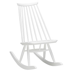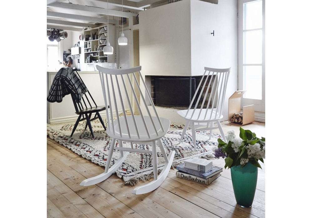 Mademoiselle Rocking chair is designed by Ilmari Tapiovaara for Artek. Tapiovaara took his inspiration from traditional spoke chairs and crafted the chair from solid birch. Due to its timeless design, Mademoiselle continues to charm even in the most contemporary interiors.