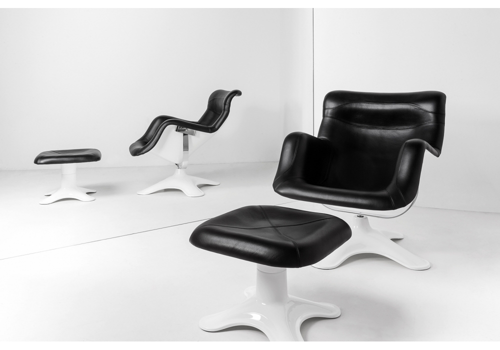 Karuselli Lounge Chair designed by Yrjö Kukkapuro for Artek is an armchair with shell in white glass fiber and chromed steel, upholstered in Sörensen Prestige leather. Fiberglass base with a swivel mechanism.