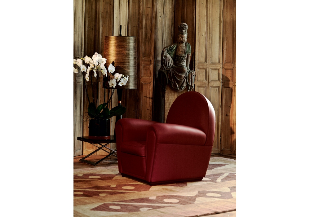 Vanity Fair designed by Renzo Frau for Poltrona Frau is an armchair with supporting structure in solid seasoned beech wood, biconical hand-tied steel springs fastened to jute belts. Supports in dark walnut-stained beech wood. Goose down filled seat cushion. Upholstery in Pelle Frau® leather or fabric. Available with pouf.