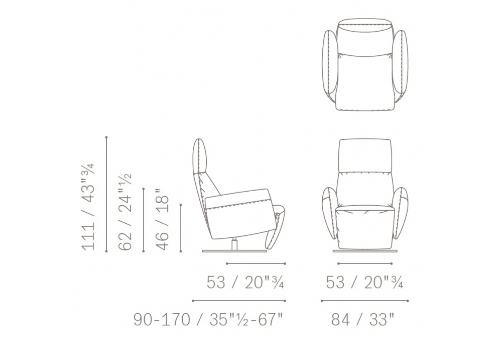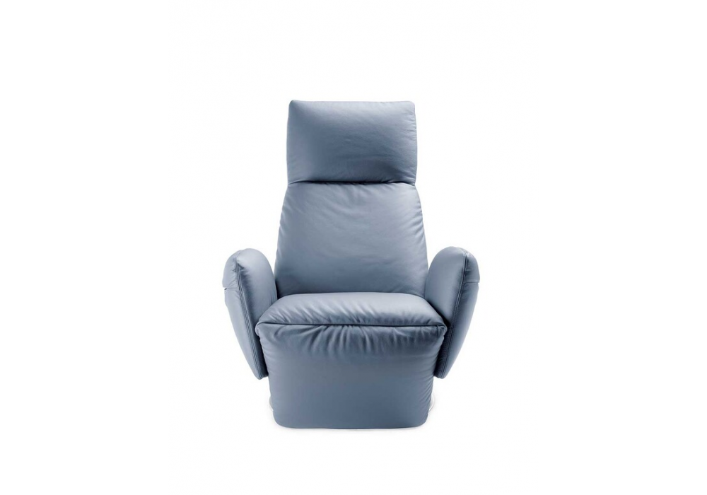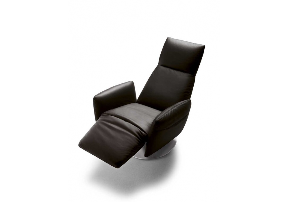 Pillow designed by Poltrona Frau is a reclining armchair with supporting structure en metal frame and birch plywood parts. Round flat steel base available in a satin-finish or matt black lacquered finish. A mechanism enables the armchair to rotate 360°. The armchair reclines manually or electrically in the rechargeable battery or mains-powered version. Upholstery not removable in leather o fabric.