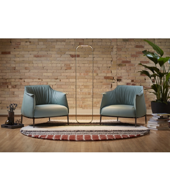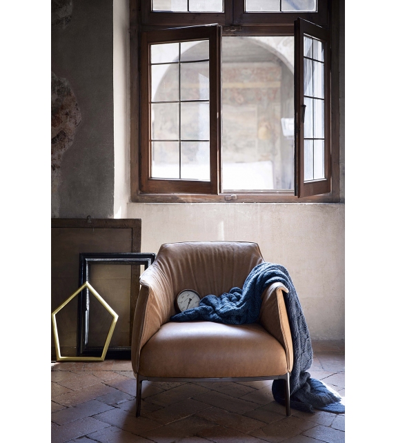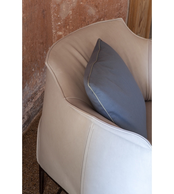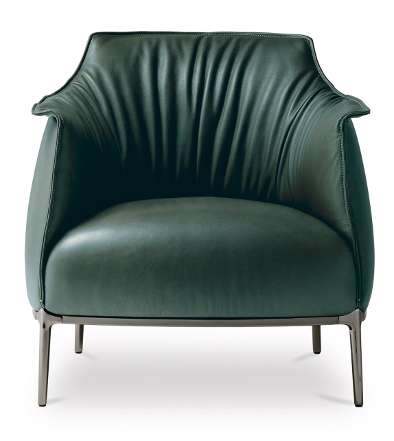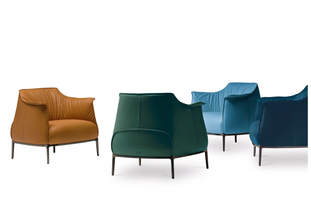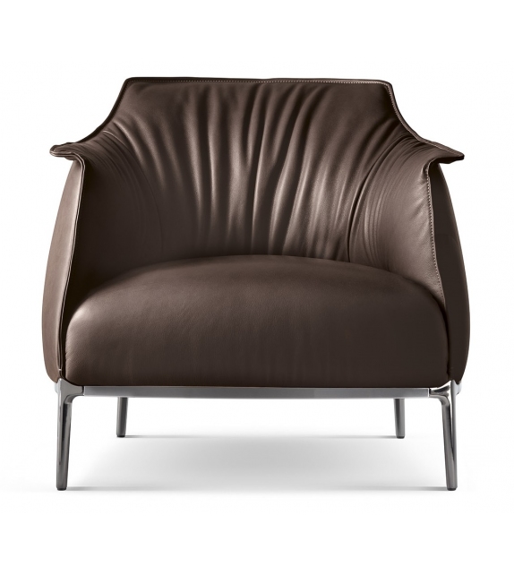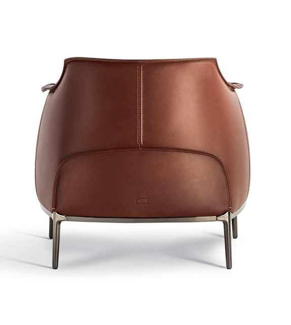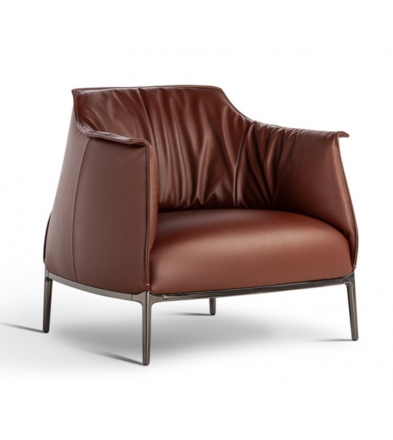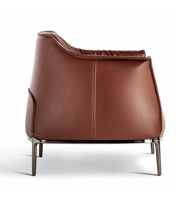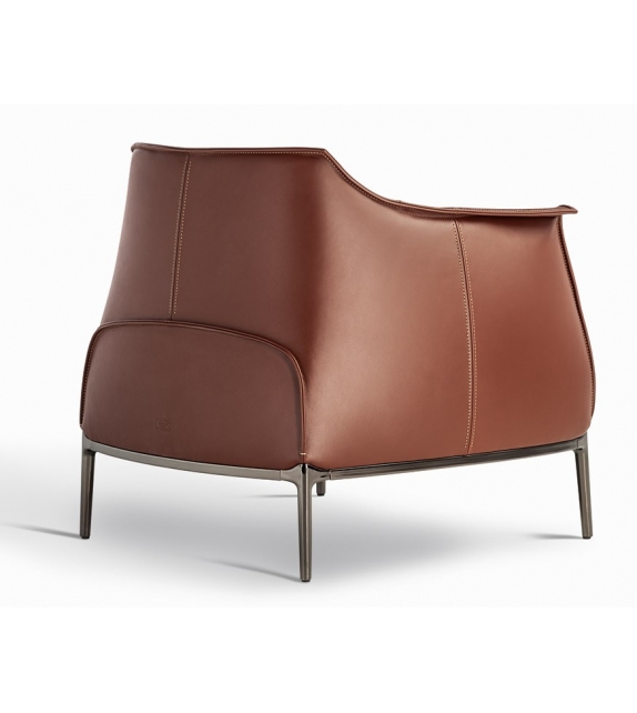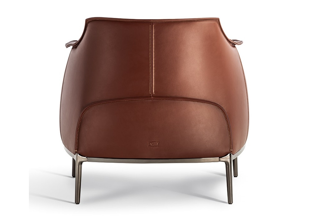 Archibald designed by Jean-Marie Massaud for Poltrona Frau is an armchair with Four cast aluminium feet connected to a tubular steel frame, available in the following finishes:gunmetal grey, burnished and titanium. It can be upholstered in leather or fabric. Contrasting stitching along the edges and on the external surfaces of the leather upholstery. Tone-on-tone stitching for the fabric version.