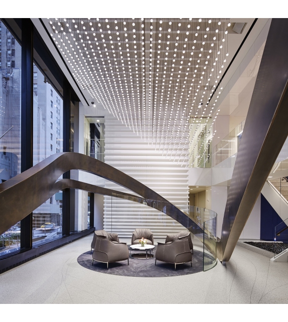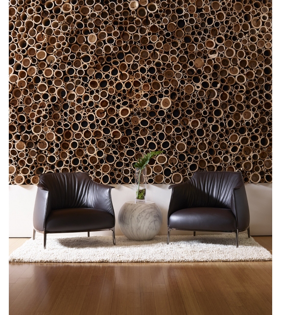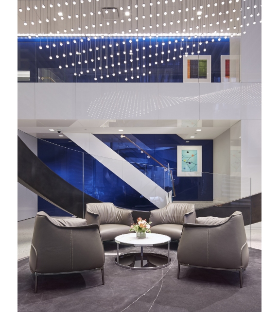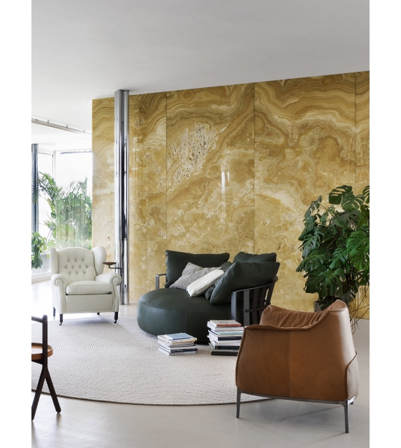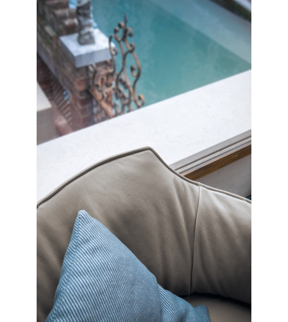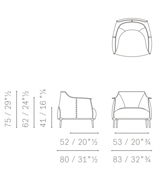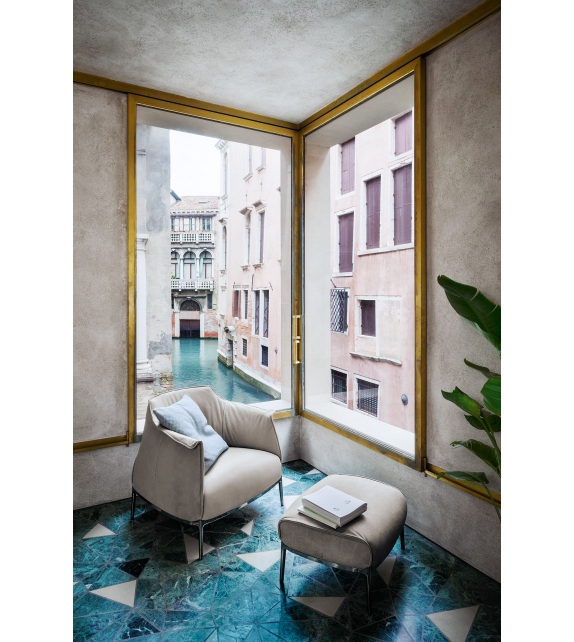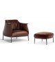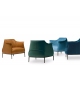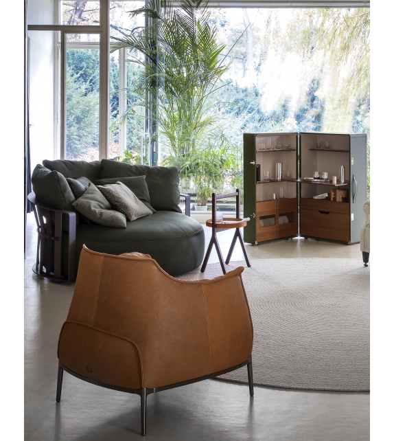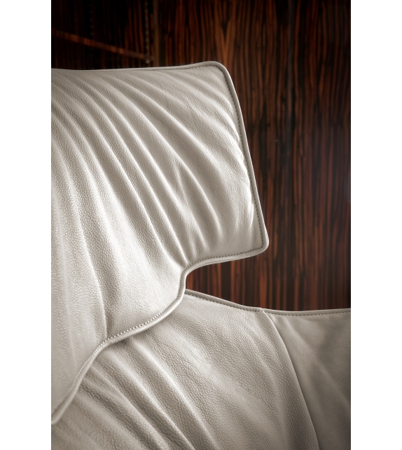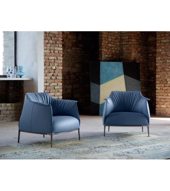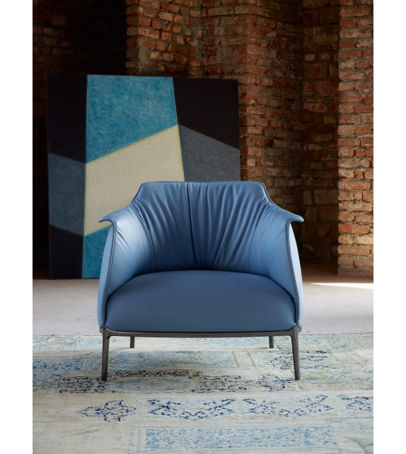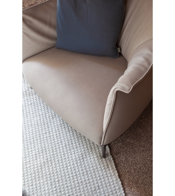 Archibald designed by Jean-Marie Massaud for Poltrona Frau is an armchair with Four cast aluminium feet connected to a tubular steel frame, available in the following finishes:gunmetal grey, burnished and titanium. It can be upholstered in leather or fabric. Contrasting stitching along the edges and on the external surfaces of the leather upholstery. Tone-on-tone stitching for the fabric version.