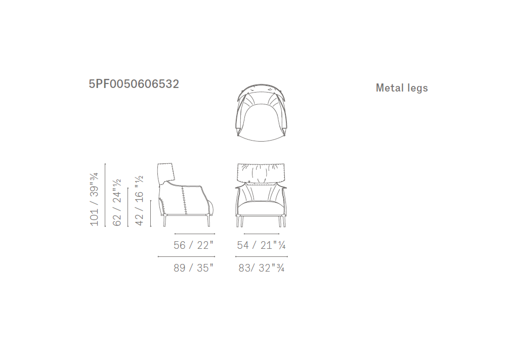 Archibald King designed by Jean-Marie Massaud for Poltrona Frau is an armchair with Four cast aluminium feet connected to a tubular steel frame, available in the following finishes:gunmetal grey, burnished and titanium. It can be upholstered in leather or fabric. Contrasting stitching along the edges and on the external surfaces of the leather upholstery. Tone-on-tone stitching for the fabric version.