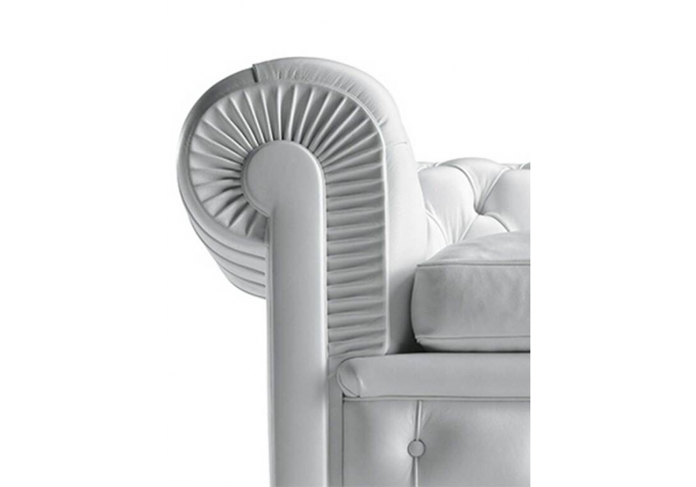 Chester, designed by Poltrona Frau, is an armchair with supporting structure in seasoned beech wood and goose down filled seat cushion. The backrest and armrests feature a handmade capitonné design. The external back is finished with a row of leather covered tacks. The feet are available in the following version: Spherical (6 cm) or high version (12 cm) in dark walnut stained beech wood or black lacquered beech wood; wooden feet (13,7 cm) upholstered in leather.