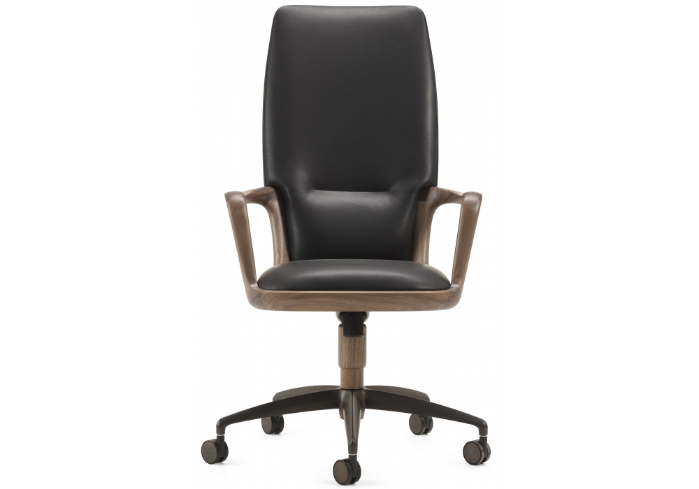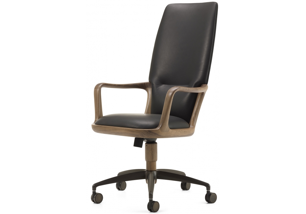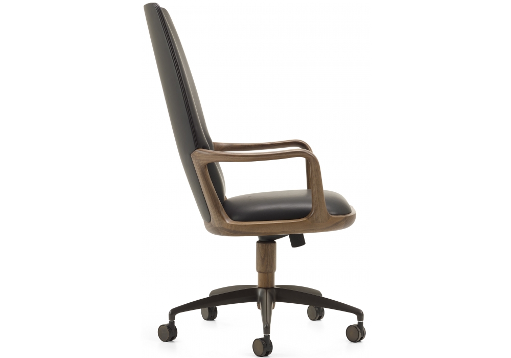 Vossia designed by Giuseppe Casarosa for Ceccotti Collezioni is a swivel armchair with structure in solid American walnut. Upholstery in fabric, leather or natural leather. Base in aluminium bronzed brass finish. 5-star base with swivel castors. Also available in 3 sizes.