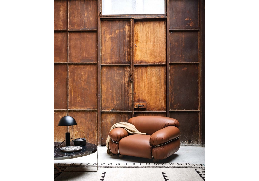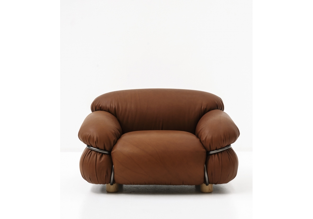 Sesann designed by Gianfranco Frattini for Tacchini is an armchair with structure in chromed or vanished finish and upholstery in fabric or leather. The feet are in wood, in different finishes.