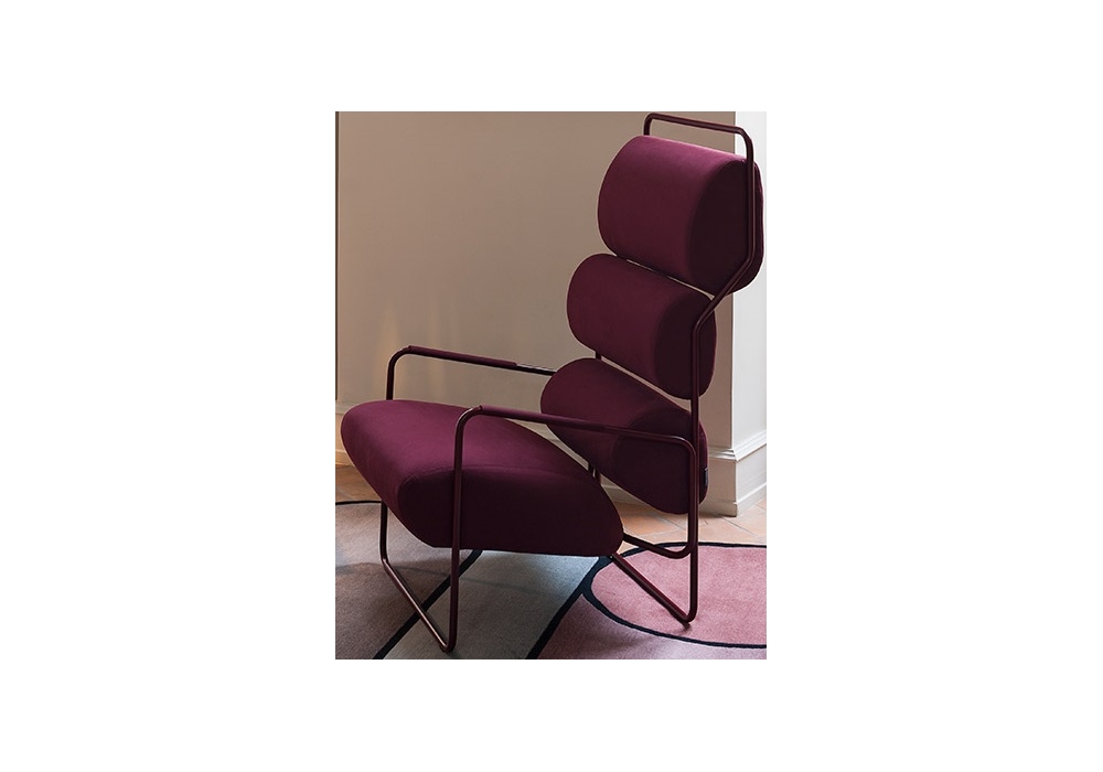 Sancarlo designed by Achille Castiglioni for Tacchini is an armchair with metal structure with elastic straps, padding in differentiated-density polyurethane foam and powder-coated tubular base. The cover is completely removable, available in different fabrics and colors.