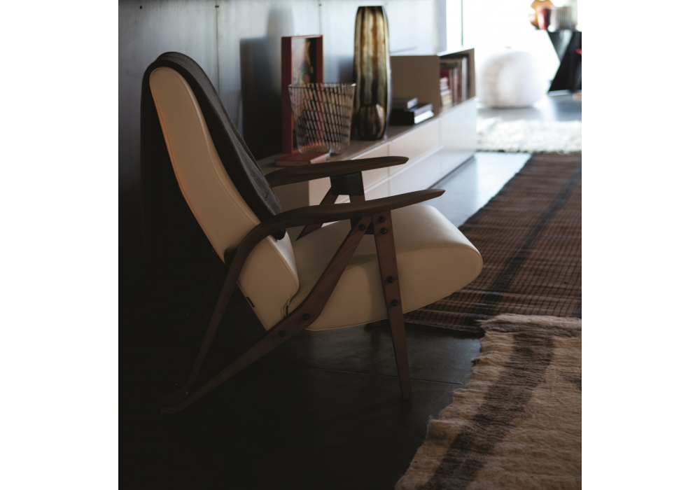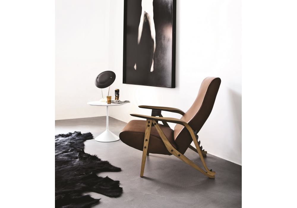 888 Gilda designed by Carlo Mollino for Zanotta is an armchair with structure in natural oak, black stained or in Canaletto walnut. Metal parts in black nickel-plated brass, adjustable backrest and upholstery in fabric or leather.