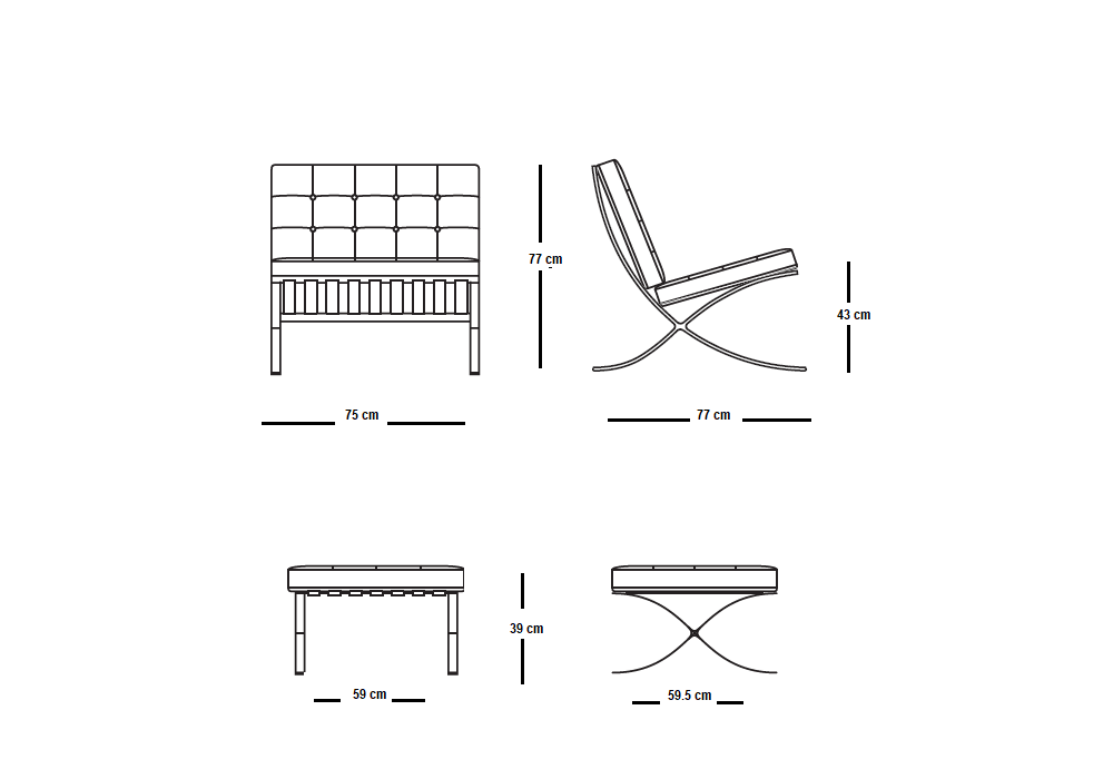 Barcelona Chair designed by Mies van der Rohe for Knoll is an armchair with a chromed steel plate structure, worked and polished by hand to obtain a mirror effect. Cushion support straps in thick leather. Upholstery made of hand-cut and sewn squares made of leather or fabric in various finishes. Available in the version with or without stool.