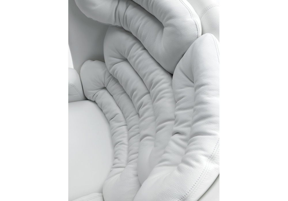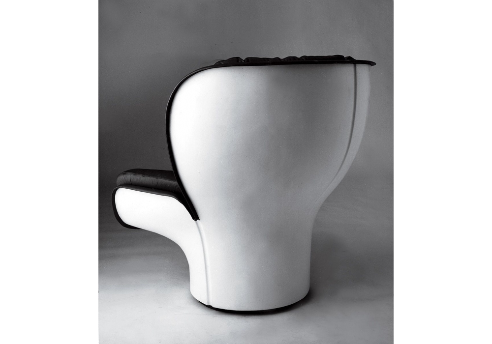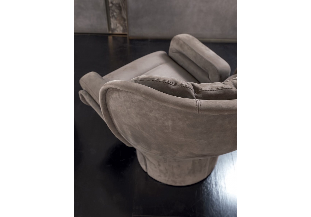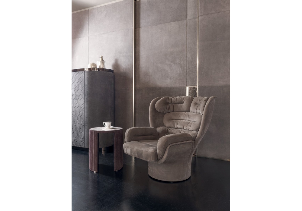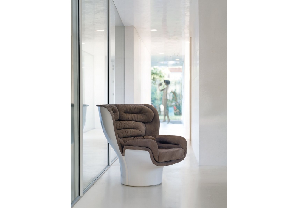 Elda designed by Joe Colombo for Longhi is an armchair with 360° swivel shell made in hand-crafted fiberglass, internal covering in non-removable leather or fabric padded with anatomical expanded polyurethane of different densities, covered in Dacron. On request, it is available with a metallic shell or fully upholstered in leather.