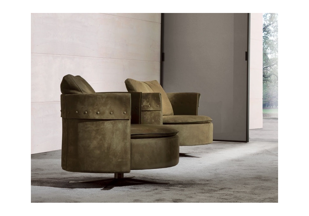 Charme designed by Giuseppe Viganò for Longhi is an armchair with backrest structure in metal assembled on a fir wood seat with elastic straps, covered in high density polyurethane foam of different densities. Seat cushion in medium density polyurethane foam and Dacron. Anatomical back cushion in sterilized goose down. The leather upholstery, given the particular workmanship, is not removable. Ground metal base with matt satin bronze finish.
