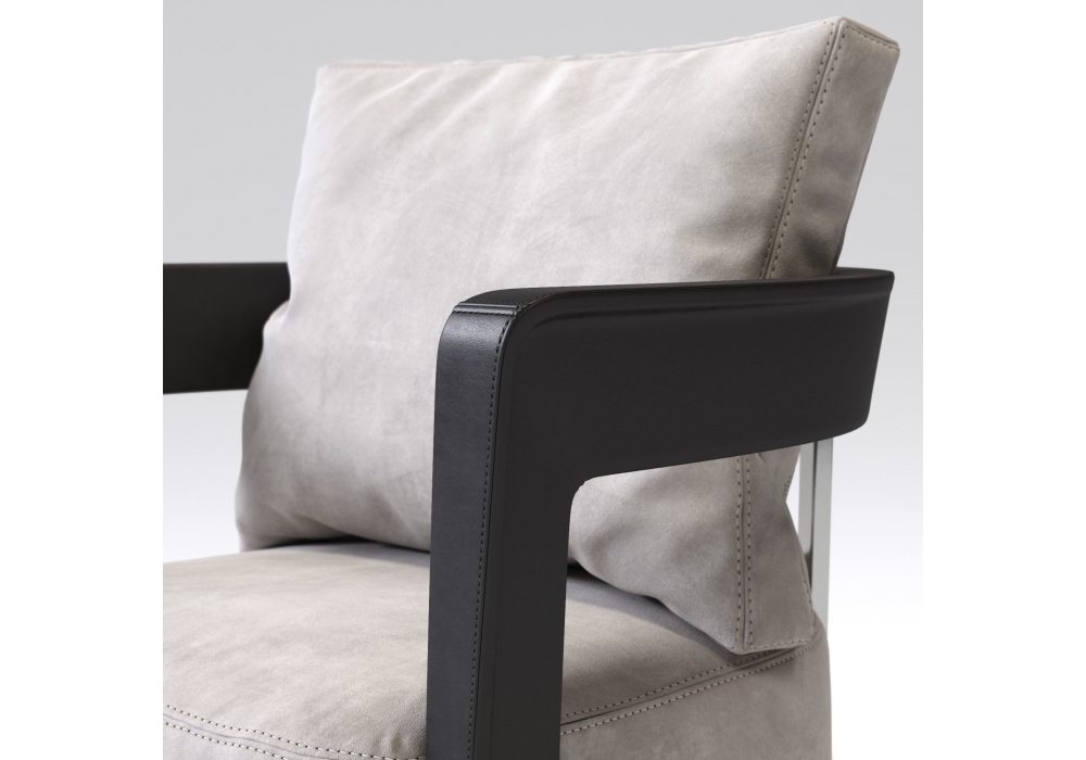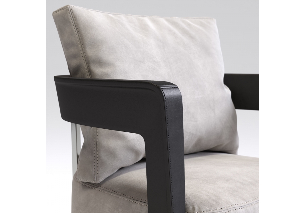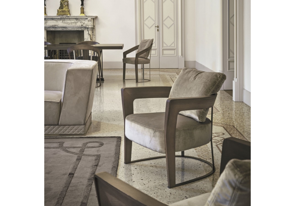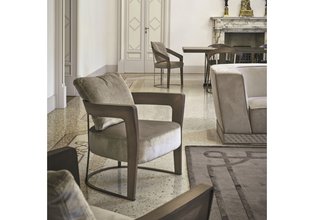 Agatha designed by Giuseppe ViganĂ² for Longhi is an armchair with structure available in wood or upholstered in leather. Seat and backrest cushions upholstered in different fabrics or leathers. Base and backrest supports available in multiple finishes.