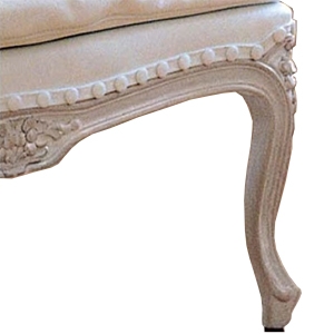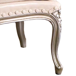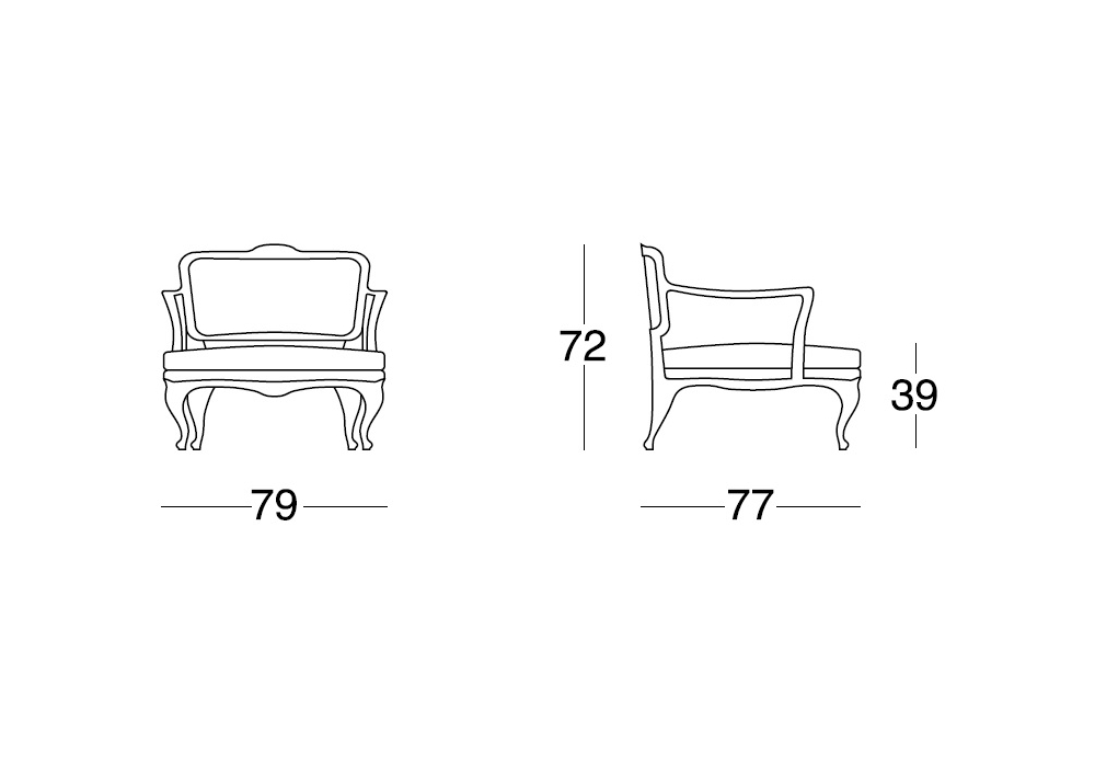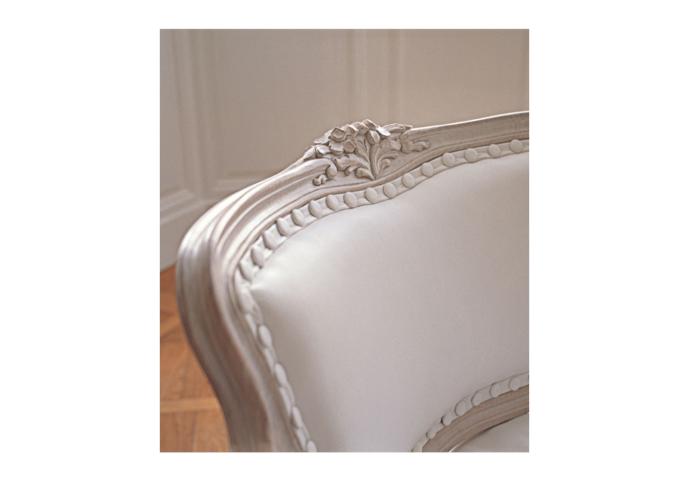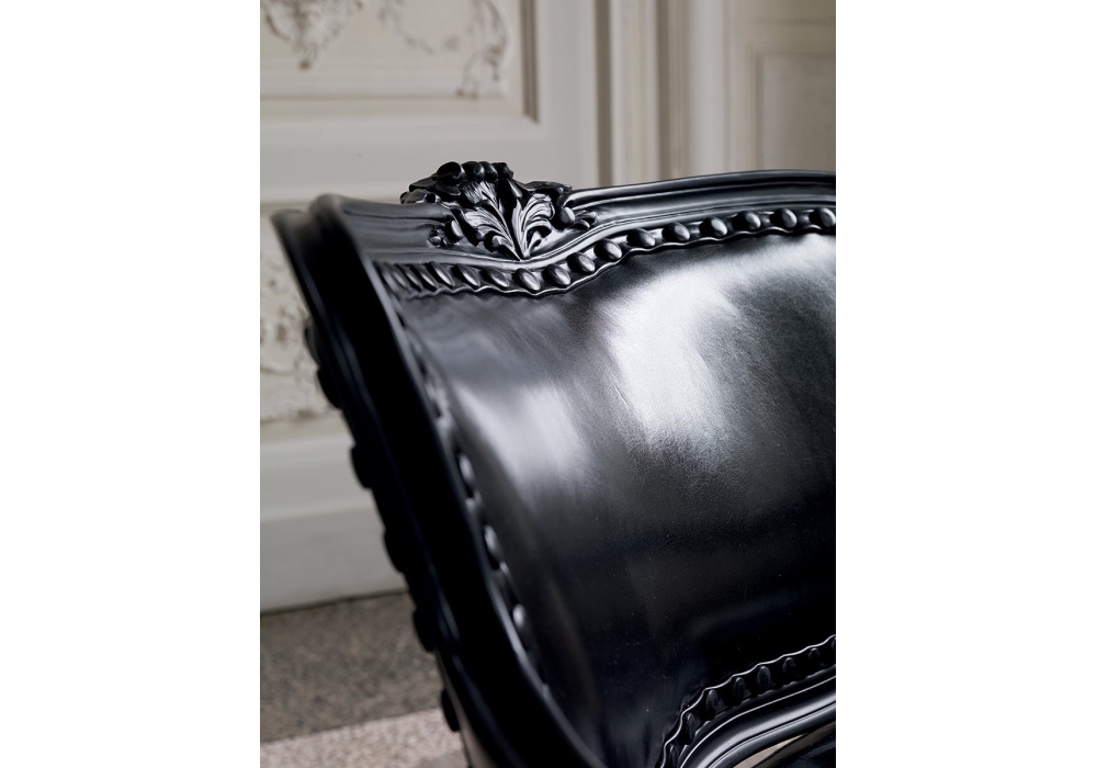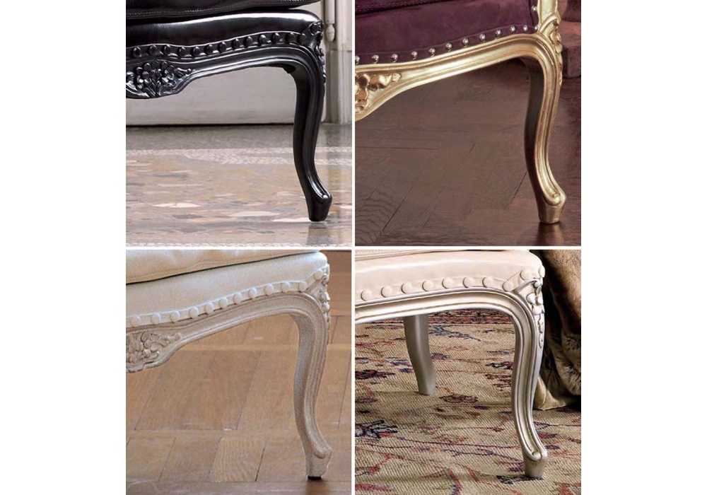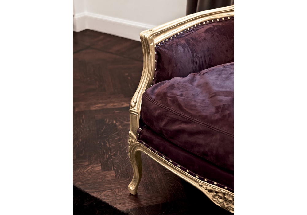 Dalia designed by Giuseppe Viganò for Longhi is an armchair with hand-carved beech wood structure in different finishes. Padding in polyurethane foam with seat cushion in sterilized goose down. Upholstery available in various fabrics or leathers. Buttons in: black nickel, light gold, antique gold, bright chrome or covered to match the cover.