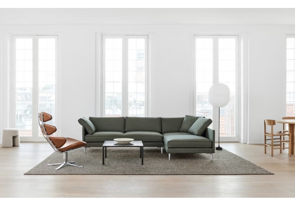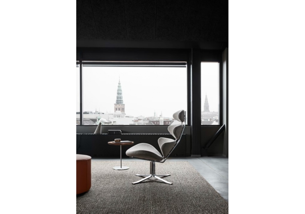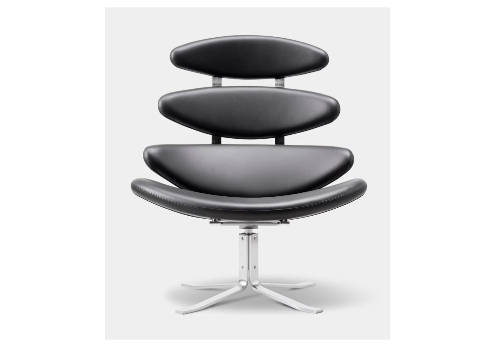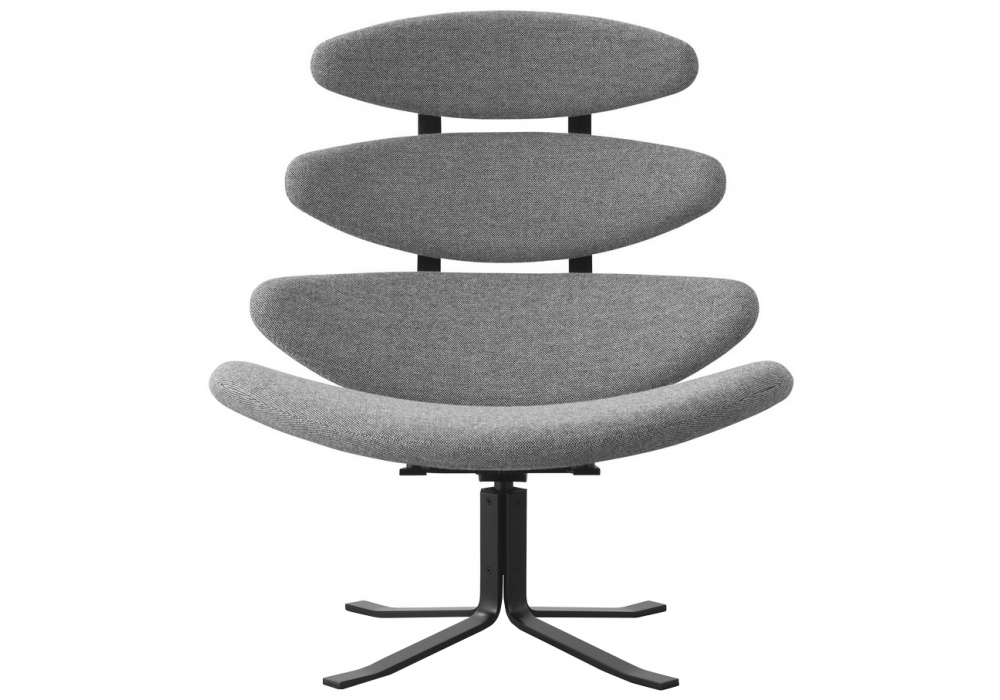 Corona designed by Poul M. Volther for Fredericia is an armchair with structure and swivel base in harmonic steel. Seat and backrest made of four separate cold-molded foam padding, completely covered in fabric or leather.