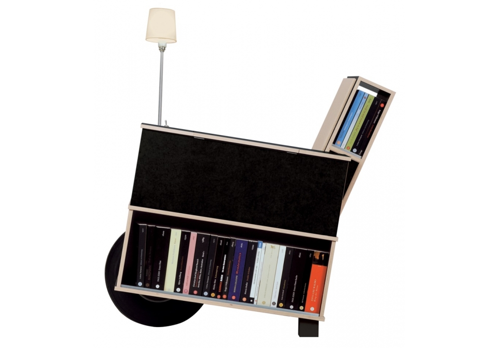 Bookinist designed by Nils Holger Moormann for Moormann is a movable chair particularly suitable for reading. It is based on the principle of a pushcart and can be rolled to a favourite spot. Approx. 80 paperbacks can be stored in the armrests and the backrest. Inclusive reading lamp and 2 hidden compartments for writing utensils in the armrests: bookmarks, pencil, pencil sharpener and a Moleskine pocketbock are included.