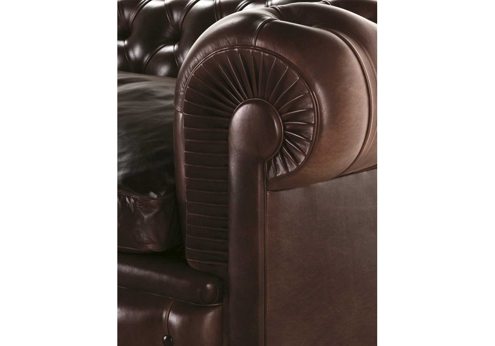 Cheste Oner, designed by Poltrona Frau, is an armchair with supporting structure in seasoned beech wood and polyurethane foam and goose down filled seat cushion. The backrest and armrests feature a handmade capitonné design. The external back is finished with a row of leather covered tacks. The feet are available in the following version: Spherical (6 cm) or high version (12 cm) in dark walnut stained beech wood or black lacquered beech wood; wooden feet (13,7 cm) upholstered in leather.