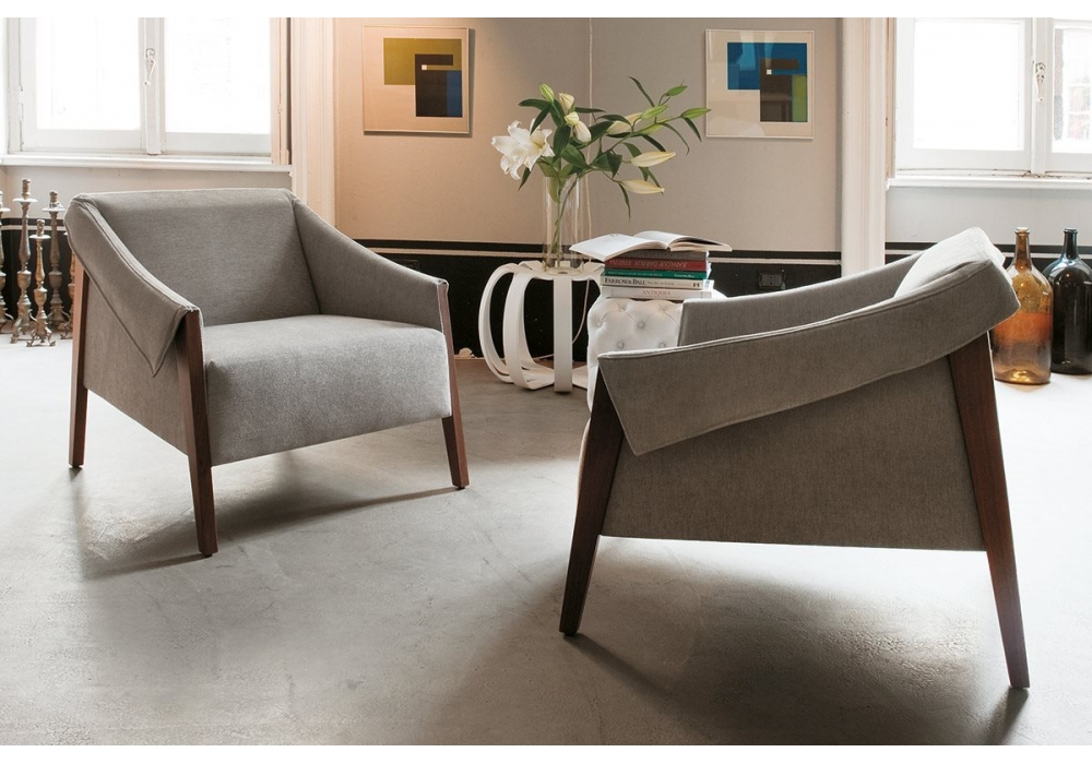 Ara designed by Giuseppe Viganó for Porada is an armchair with frame in solid canaletta walnut or matt lacquered closed pore available in different finishes. Upholstery in fabric or leather.
