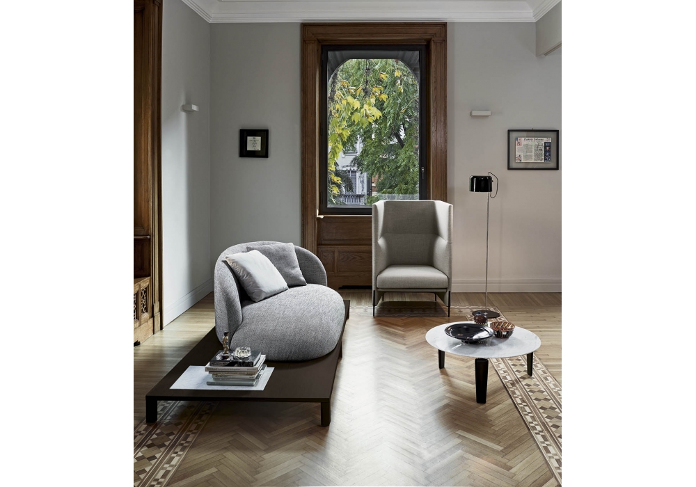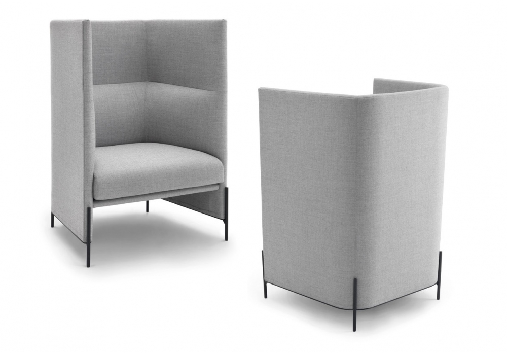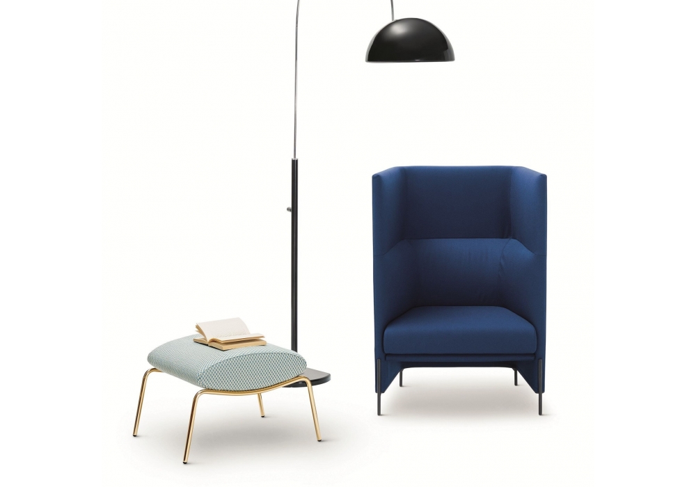 Algon designed by Luca Nichetto for Arflex is a high-backed armchair, metal base. Seat cushion in shaped polyurethane with differentiated density / polyester fiber. Fabric or leather upholstery.