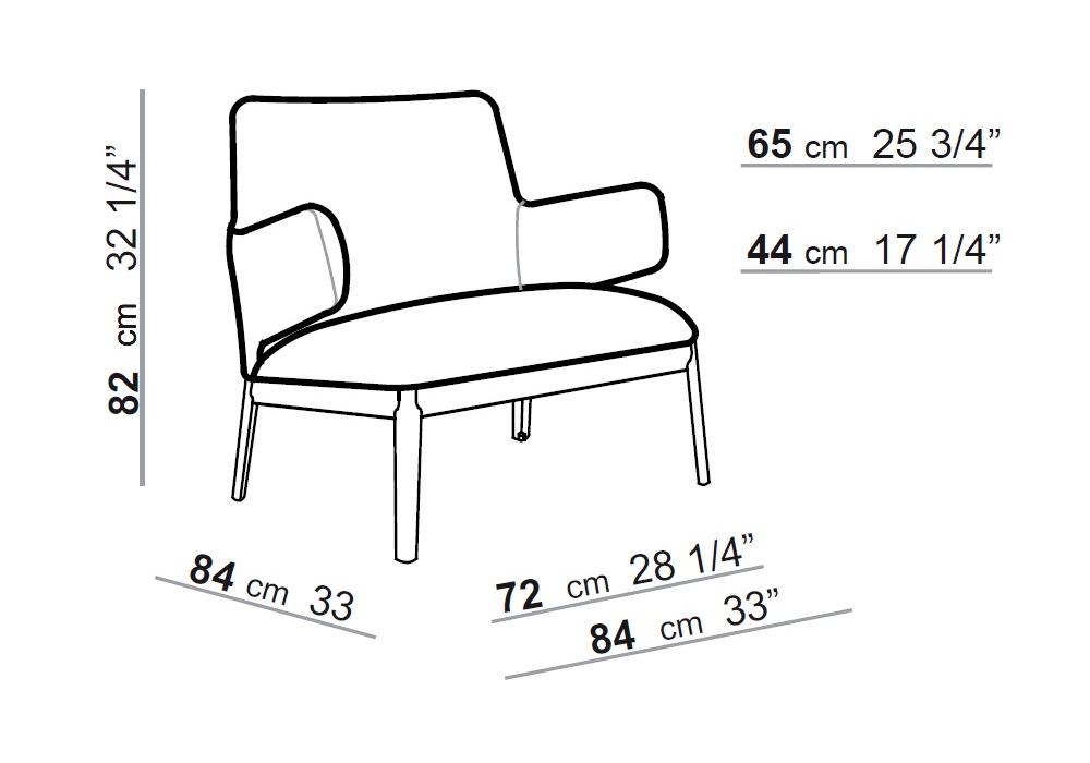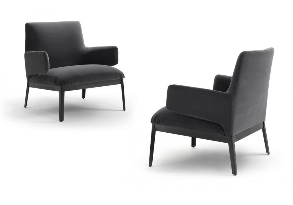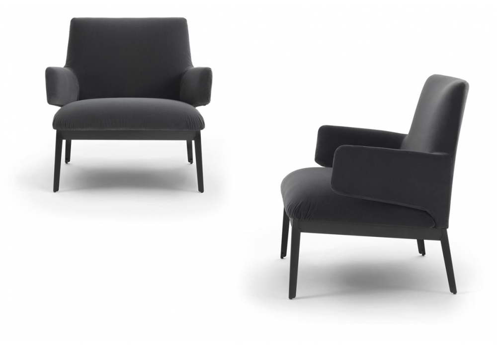 Hug designed by Claesson Koivisto Rune for Arflex is an armchair with a lacquered metal base, with adjustable black PVC feet. Profiles in Canaletto walnut, wenge, oak or chocolate stained wood. Fabric or leather upholstery.