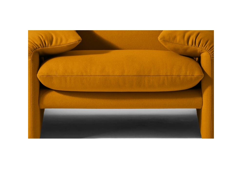 675 Maralunga designed by Vico Magistretti for Cassina is an armchair made with a plastic base, padding in CFC-free polyurethane foam and polyester wadding and upholstery in fabric or leather.
