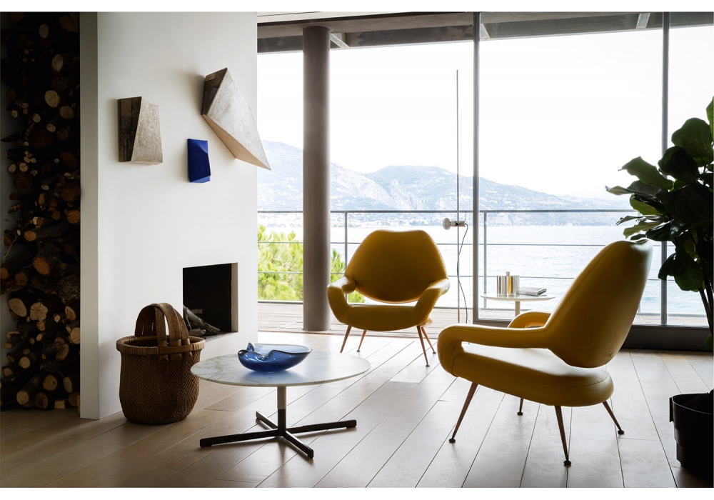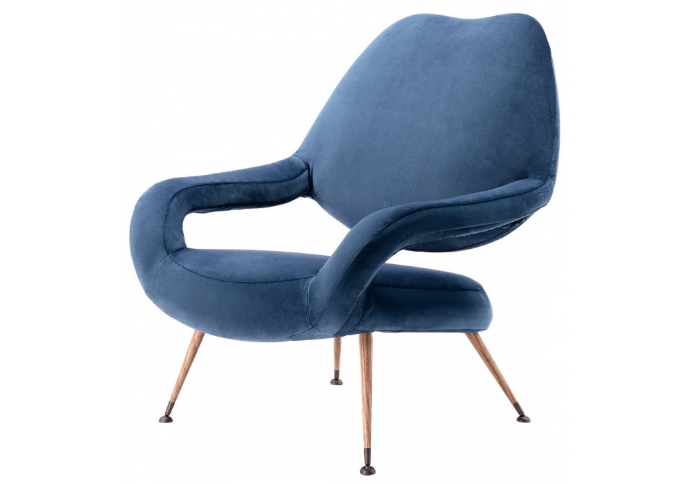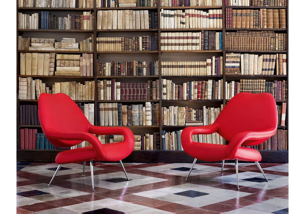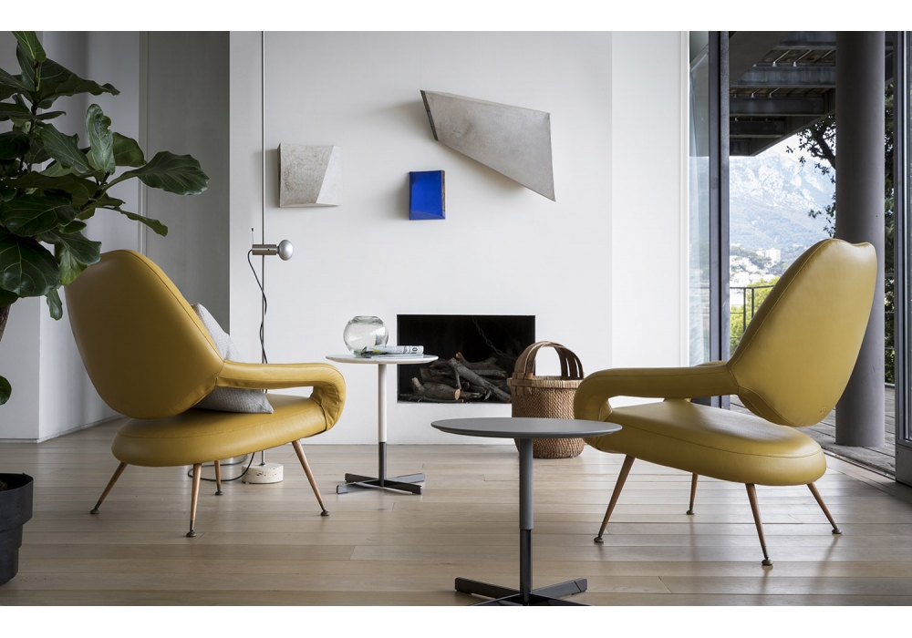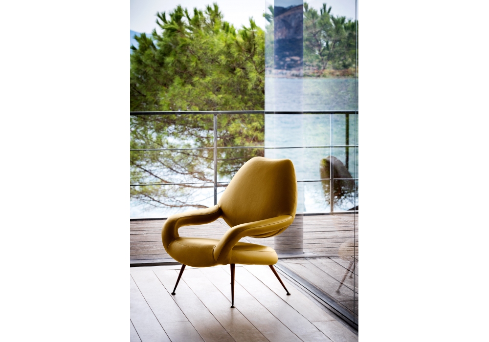 DU 55, designed by Gastone Rinaldi for Poltrona Frau, is an armchair with supporting structure in steel, padding in moulded polyurethane foam. Conical steel feet available in three finishes: ash veneered in a teak stain with antique-finish and brass caps; black textured coated, with a wrinkled effect, with black caps; chromed polish with chromed caps. Upholstery in Pelle Frau® leather or fabric.