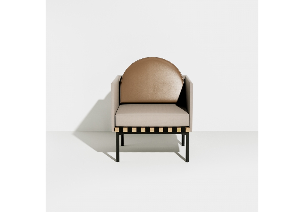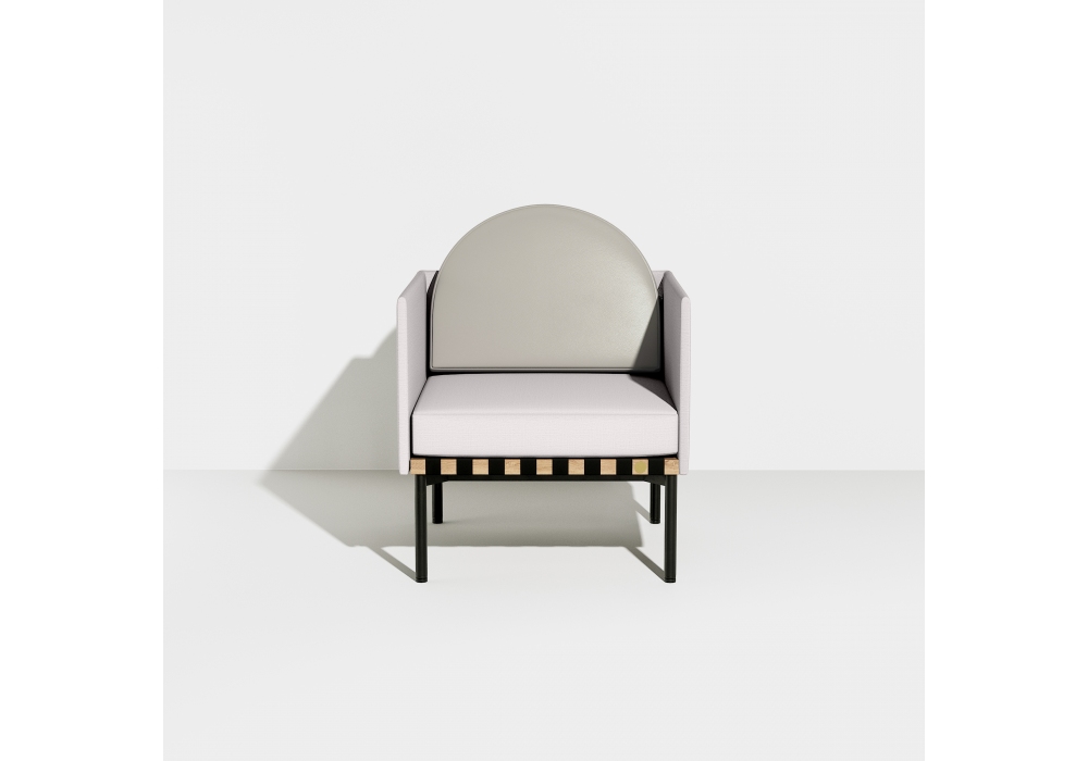 Grid designed by Pool for Petite Friture is an armchair with or without armrests made with a wooden structure, steel base and covering in different types of fabric. Round cushion covered in fabric or leather.