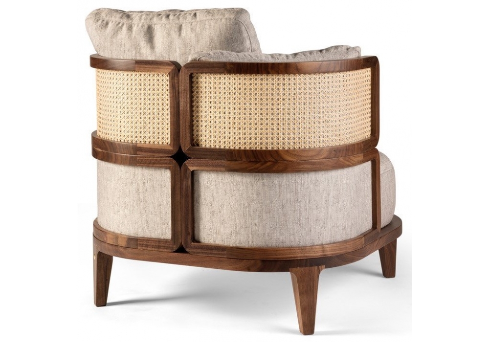 Promenade designed by Philippe Nigro for Gebrüder Thonet Vienna is a lounge chair with structure in Canaletto walnut. Trim available in woven cane for the upper range. Seat and cushions filled with polyurethane foam with different densities, goose feather and polyester.