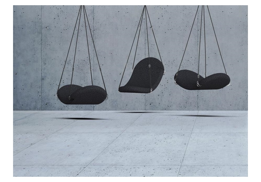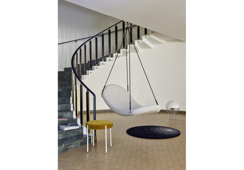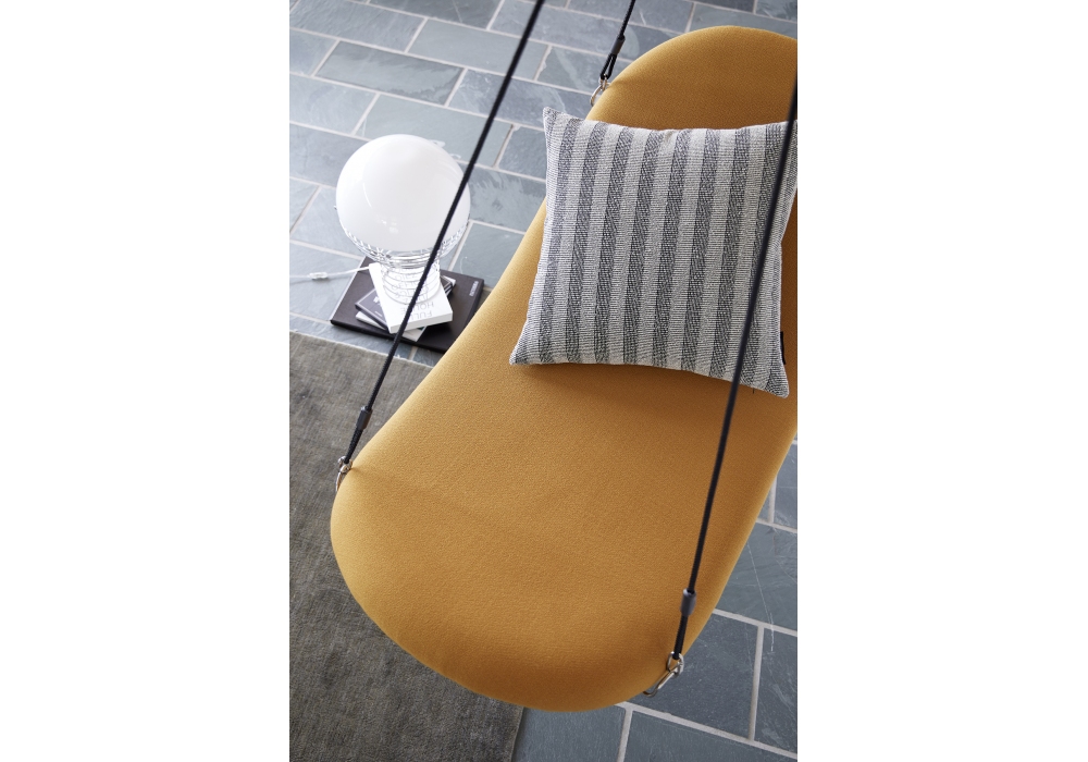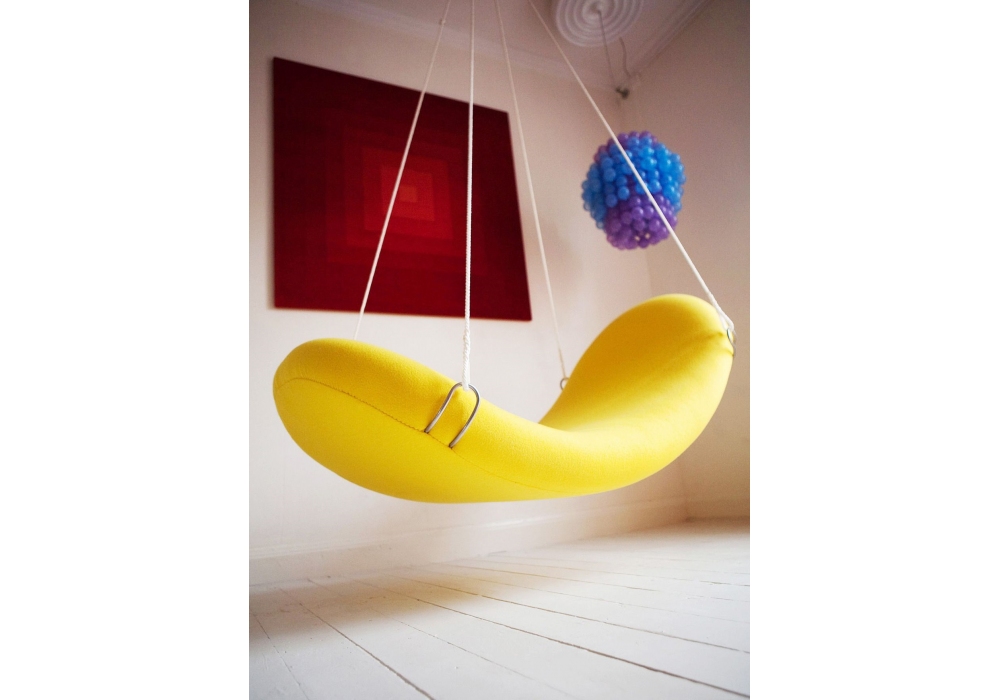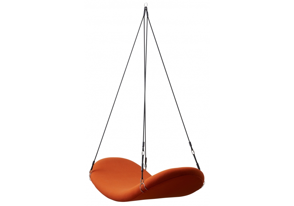Flying Chair designed by Verner Panton for Verpan is a fully upholstered swing. It is suspended from the ceiling on both sides by nylon ropes that allow you to adjust the height and sitting position. Molded plywood shell and steel frame surrounded by foam and nylon strings incl. Upholstery in different fabrics.