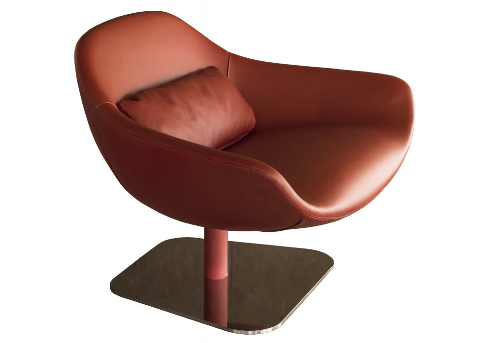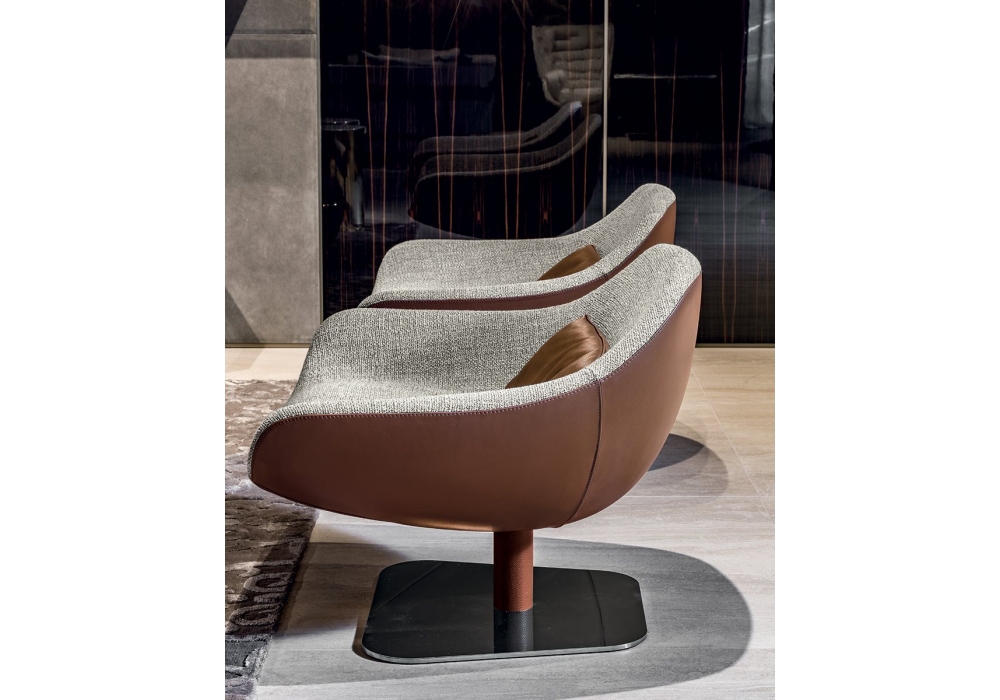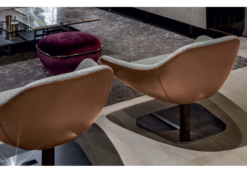 Meredith designed by Giuseppe ViganĂ² for Longhi is an armchair with metal frame, cold-moulded in foam. The base rotates completely with a self-aligning mechanism in the same finish as the chair. Lumbar cushion in sterilised goose down with removable cover. Metal base available in different finishes.
