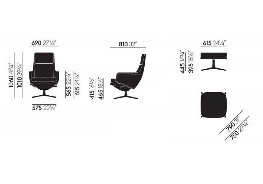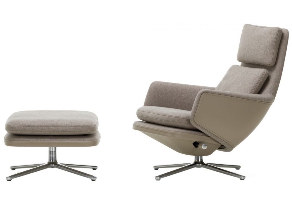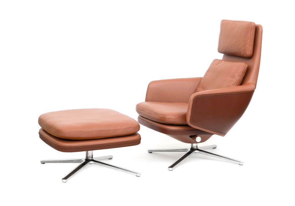 Grand Relax & Ottoman designed by Antonio Citterio for Vitra is a reclining armchair and footrest, with four-spoke swivel base in die-cast aluminum, polished or powder-coated finish. The shell, the backrest and seat cushion are covered in leather.