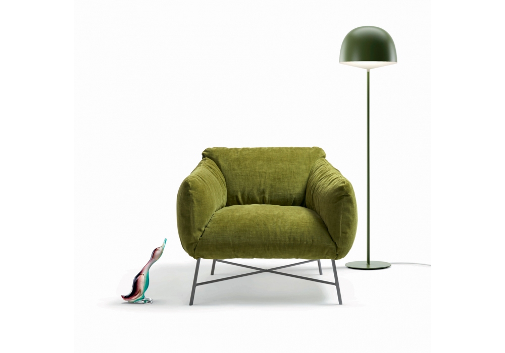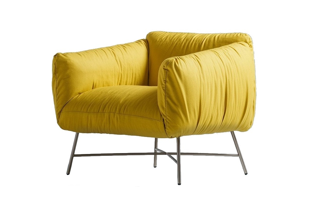 Jolie designed by Angelettiruzza for My Home Collection is an armchair made with a wooden structure covered in polyurethane rubber and goose feathers. The upholstery is in leather or fabric. The base is in chromed or painted steel. Jolie is available in different cover and base finishes.