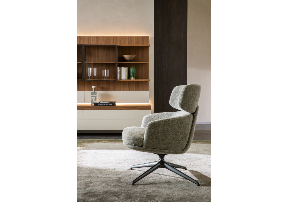 Piccadilly designed by Rodolfo Dordoni for Molteni&C is an armchair made with a swivel base in aluminum or pewter and upholstery in fabric or leather in different finishes. Available with low back or high back.