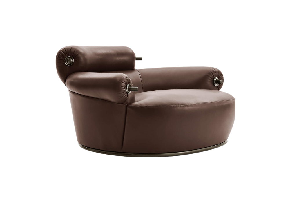 Toro designed by Luigi Caccia Dominioni for Azucena is an armchair, with upholstery available in different materials. Base with metallic gray finish and studs with bronze finish.