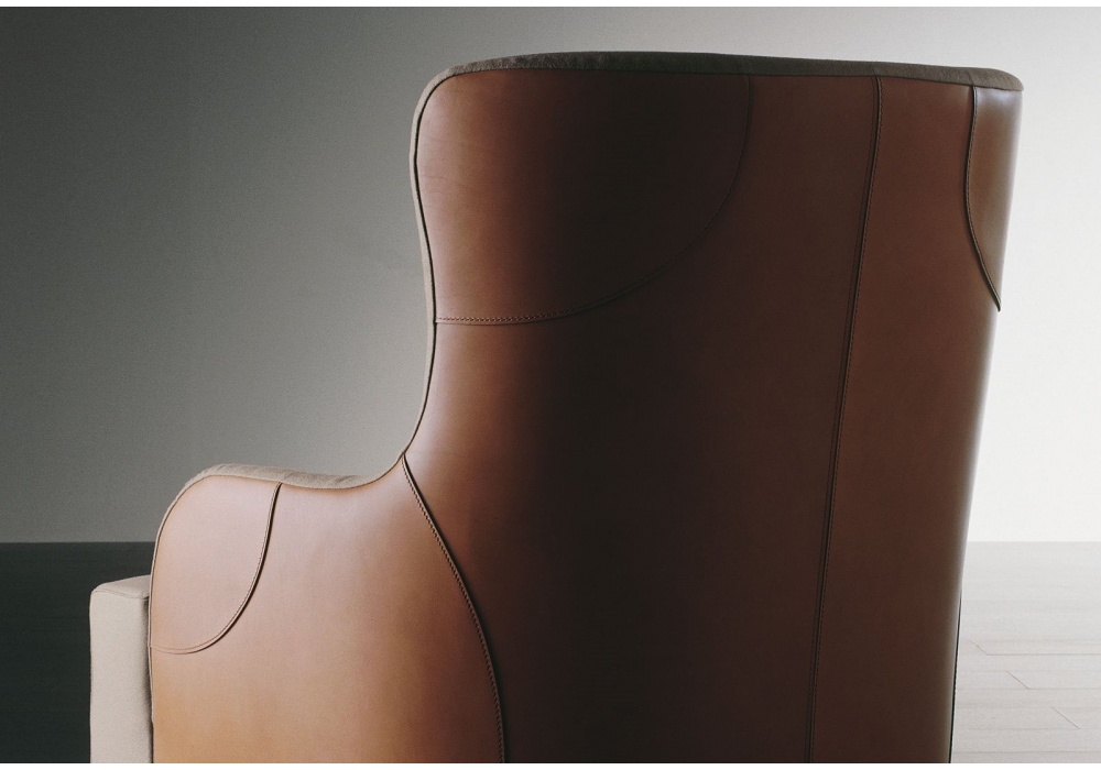 Liu Kuoio designed by Andrea Parisio for Meridiani is a bergère with black stained oak base. Lumbar cushion in reinforced feathers. Outer shell in saddle leather and inner cover in fabric.