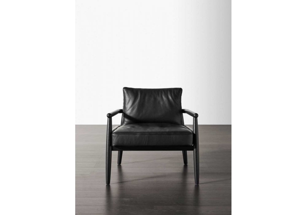 Teresa designed by Andrea Parisio for Meridiani is a padded armchair with frame in solid stained oak. Black plastic glideys. Padded seat and back in polyurethane foam with different densities and feathers. By Meridiani leather, cover with wide double lapped seam.